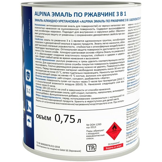 Грунт- эмаль по ржавчине 3 в 1 Alpina зеленая (ral 6002) 0,75 л (1/6) " информация: