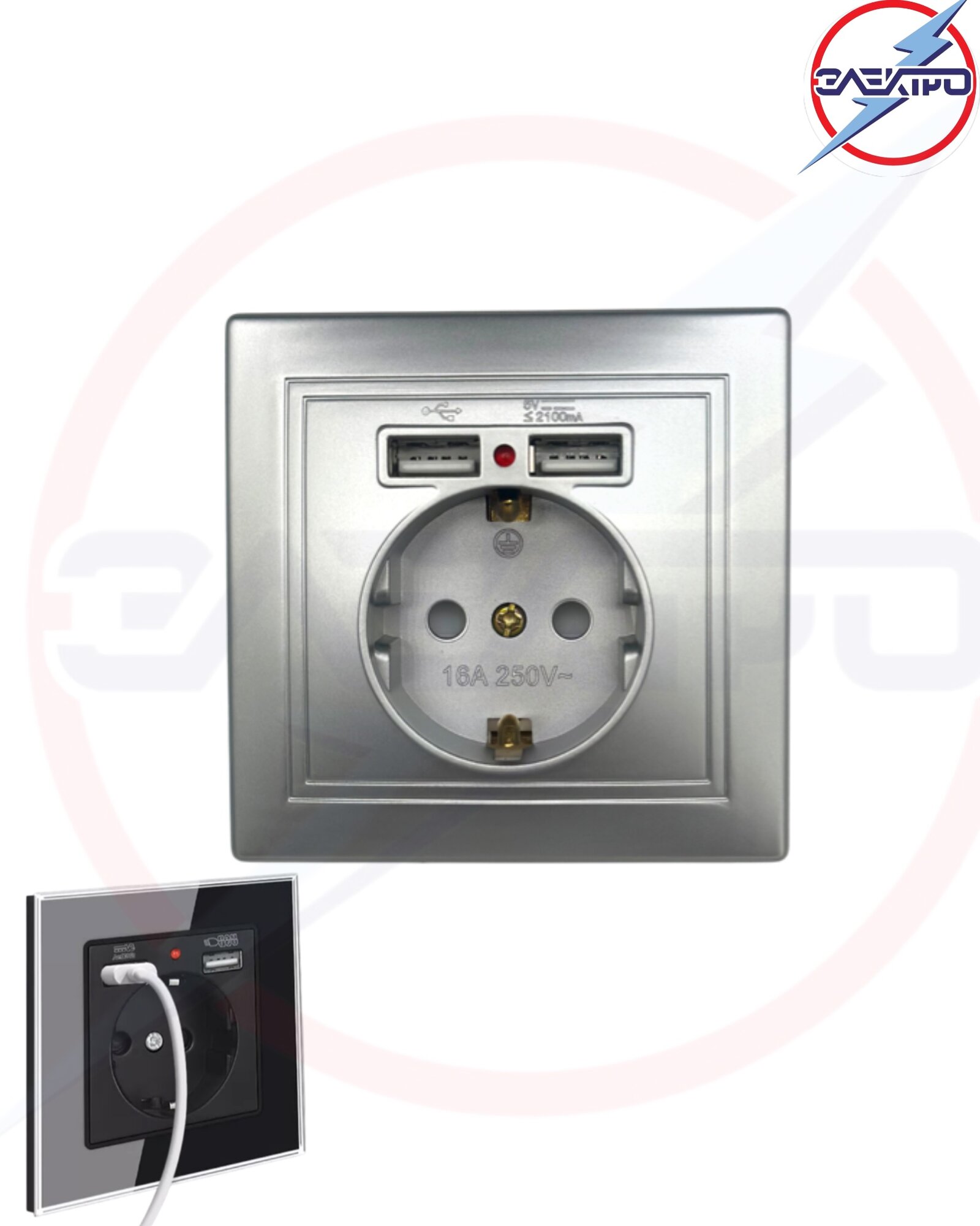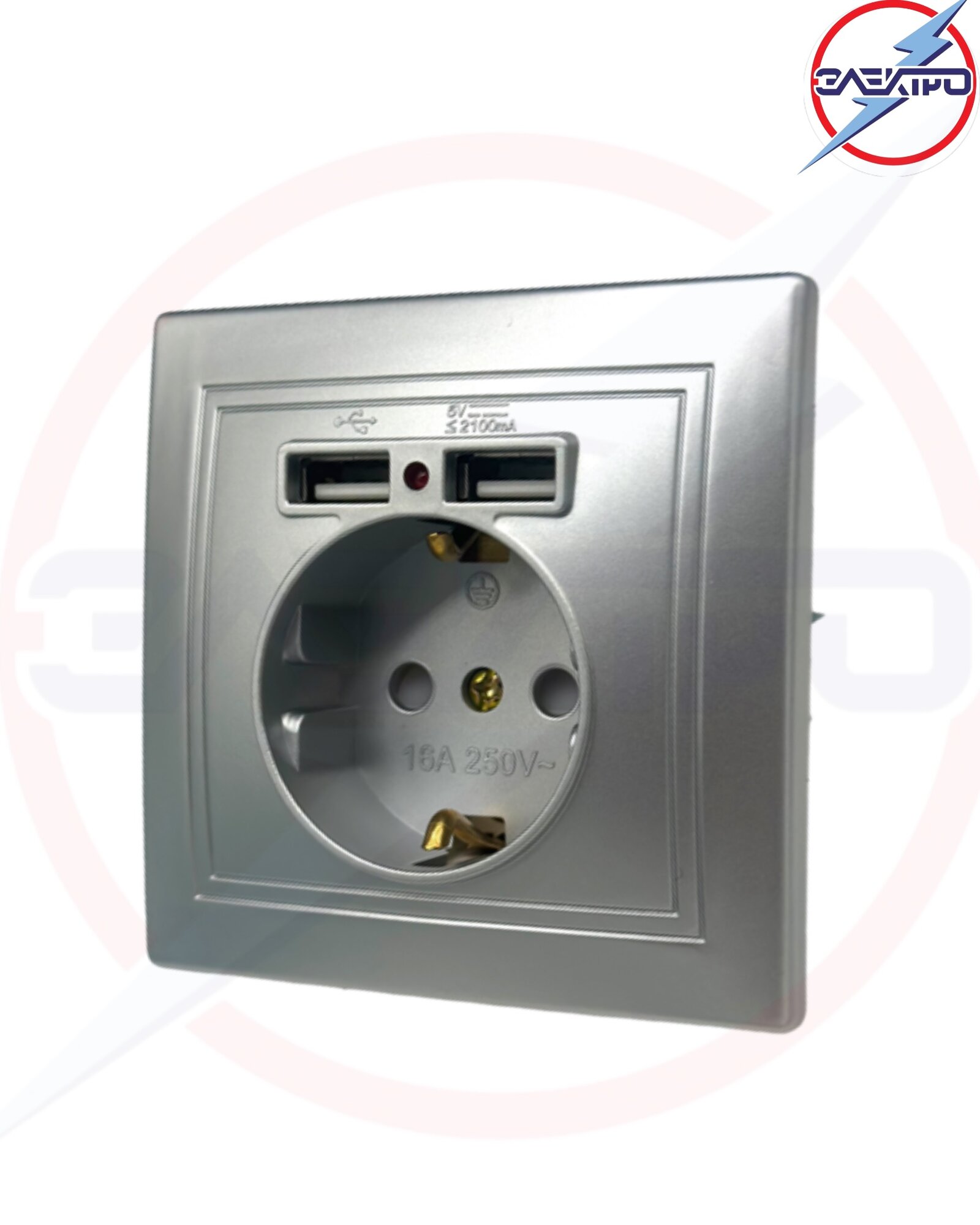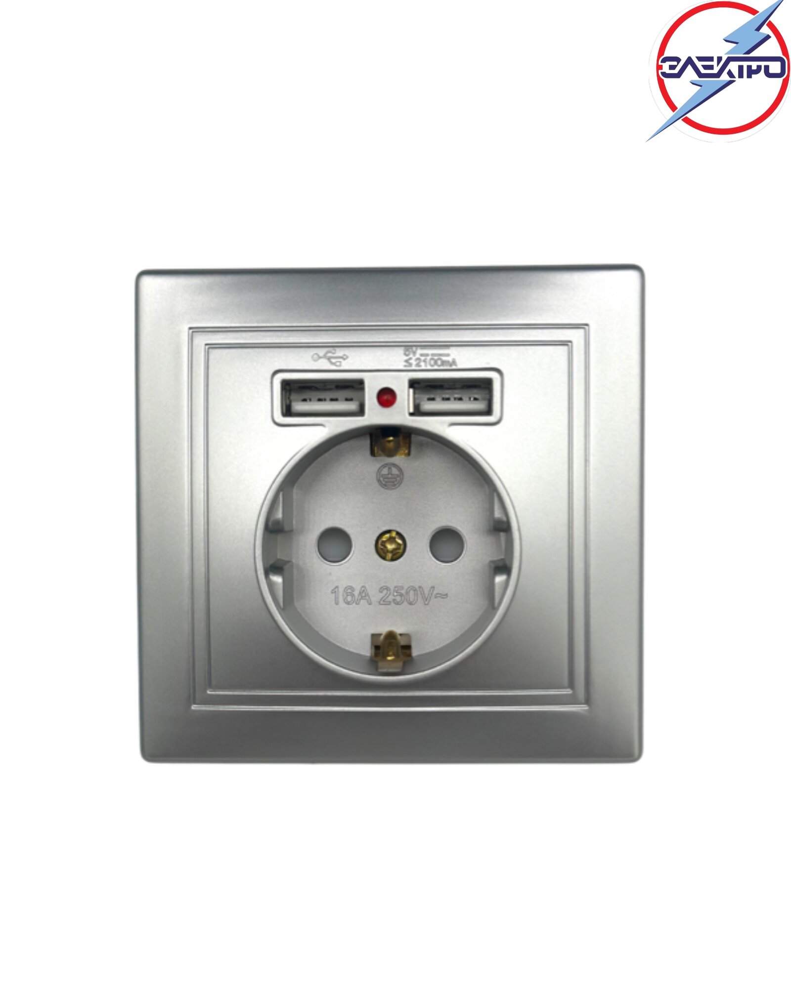 Розетка с заземлением Мира +2 USB, серебро информация: