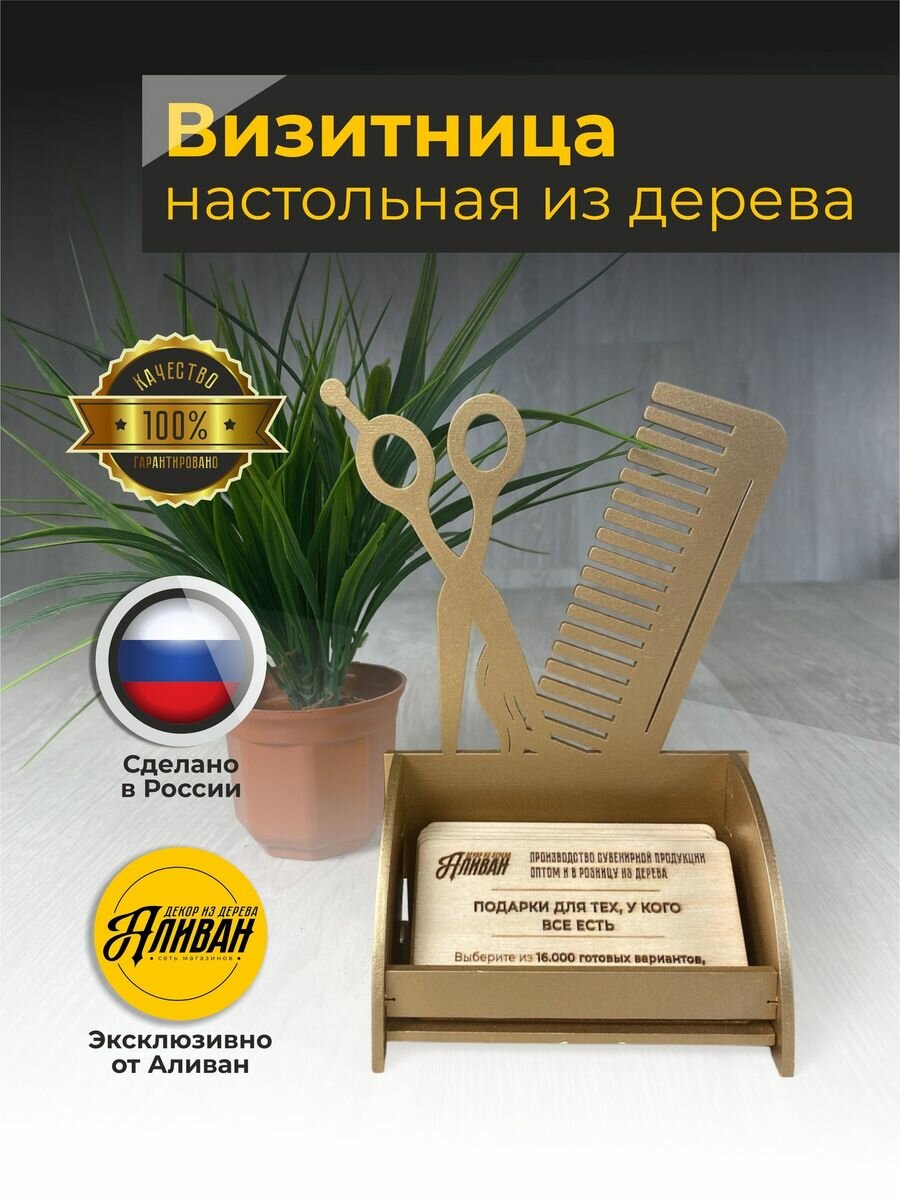 Подставка под визитки дерево парикмахер ножницы расчёска золотистый 538 ₽