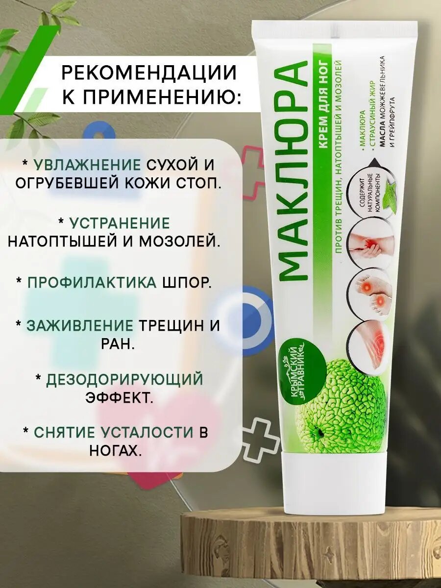 | Комплектация | Крымский травник Маклюра крем для ног от трещин, натоптышей и мозолей бальзам Натуральная Крымская косметика заживляет кожу стоп при трещинах снимает усталость ног препятствует появлению неприятного запаха |