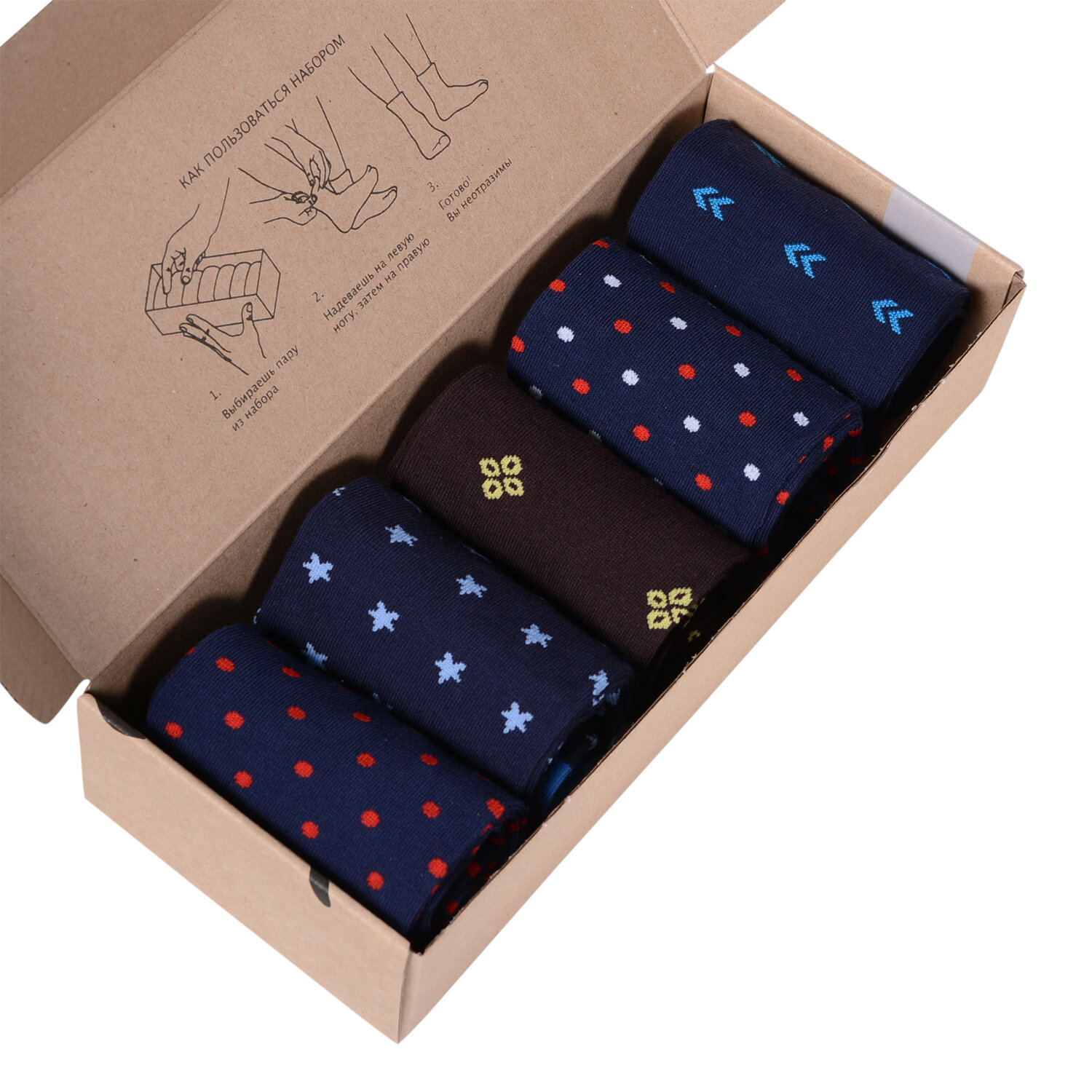 НС-5-204 Набор из 5 пар мужских носков "Нева-Сокс" темно-синие горох звезда стрелка принт рисунок яркие цветные разноцветные повседневные длинные высокие средние хлопок хб хлопковые коробка комплект подарок