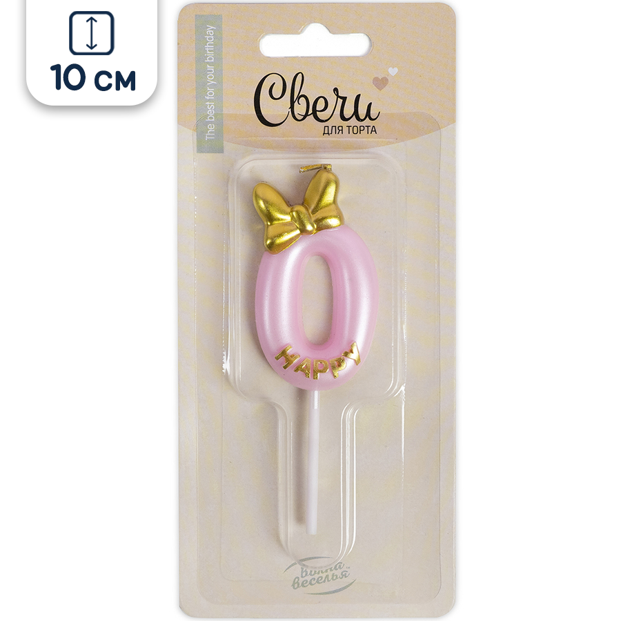 Свеча для торта парафиновая Riota Золотой бант, Цифра 0, розовый, 10 см, 1 шт. информация: