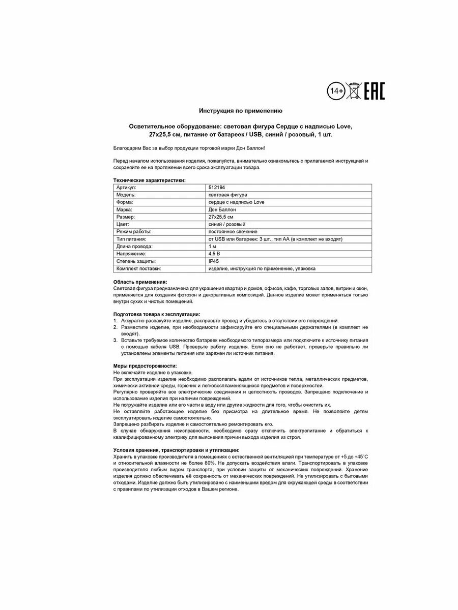 | Количество предметов | 1 шт. |