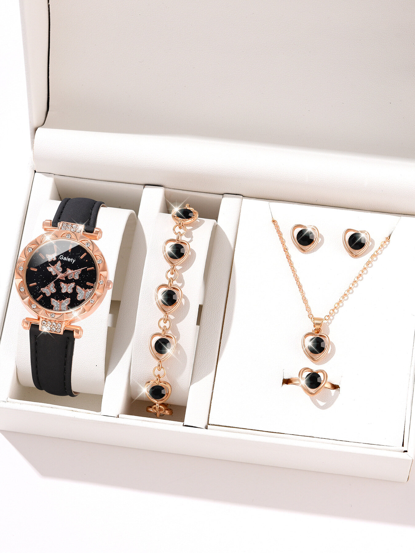 Часы наручные женские с браслетом, цепочкой с кулоном, серьгами и кольцом 469 ₽