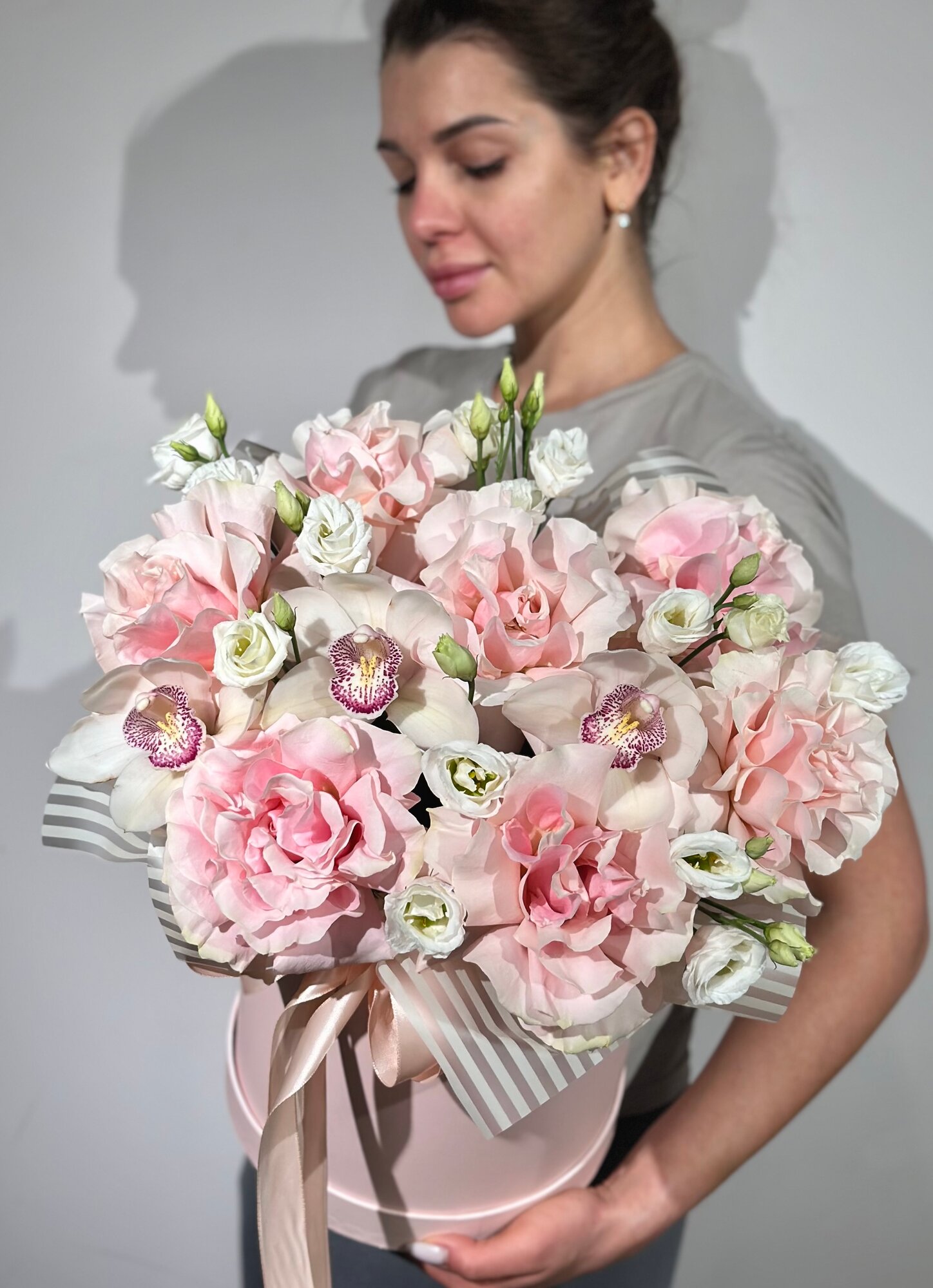 Отзывы на Французские розы с орхидей и эустомой в шляпной коробке и атласными лентами , композиция в коробке с доставкой