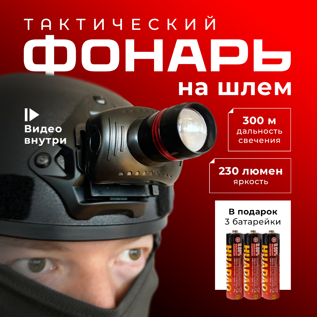 Нашлемный фонарь, тактический, влагозащищенный, светодиоды, дальность освещения 300 метров информация: