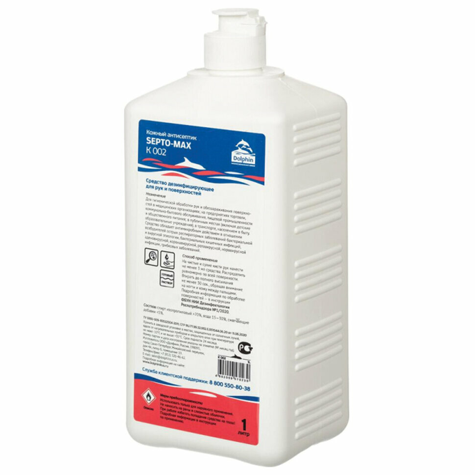 Антисептик для рук и поверхностей спиртсодержащий (70%) с дозатором Dolphin Septo-Max, 1 л, К002-1д, 609124 информация: