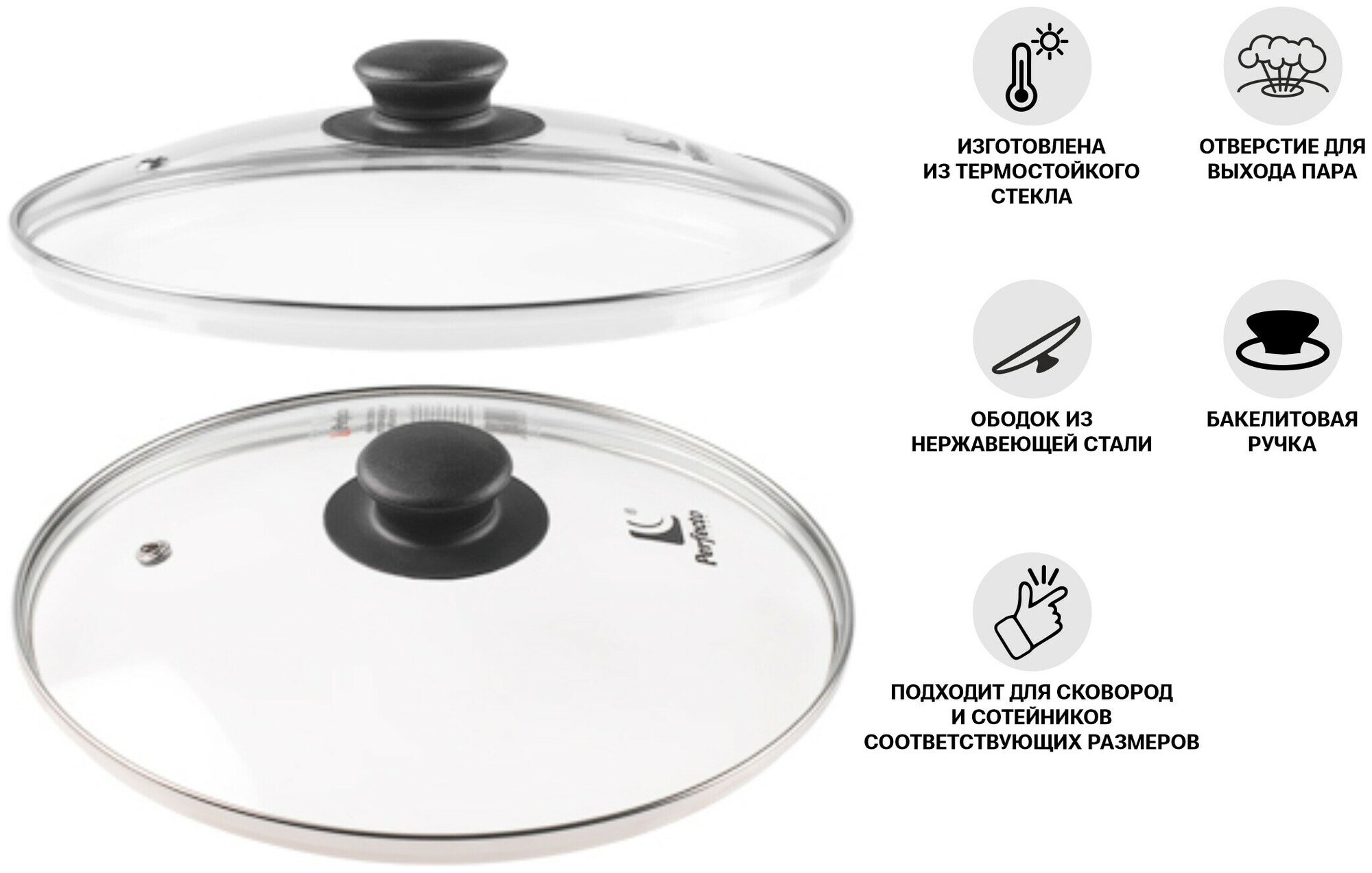 Perfecto Linea Крышка стеклянная, 260 мм, с металлическим ободом, круглая, (Стеклянная крышка на сковороду диаметром 26 см с паровыпуском изготовлена 490 ₽