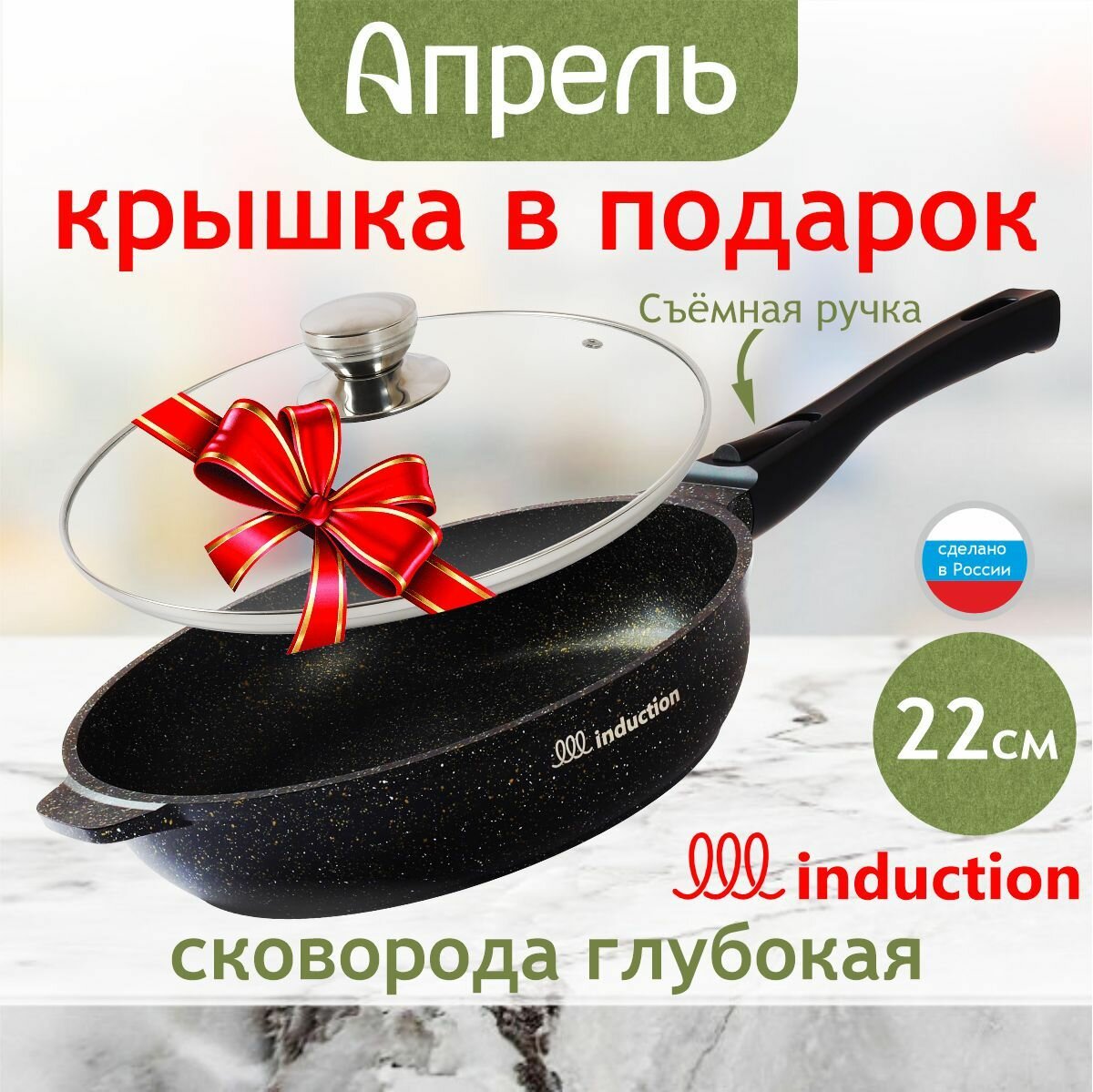Сковорода для индукционной плиты "Апрель" 22см с антипригарным покрытием со съемной ручкой информация: