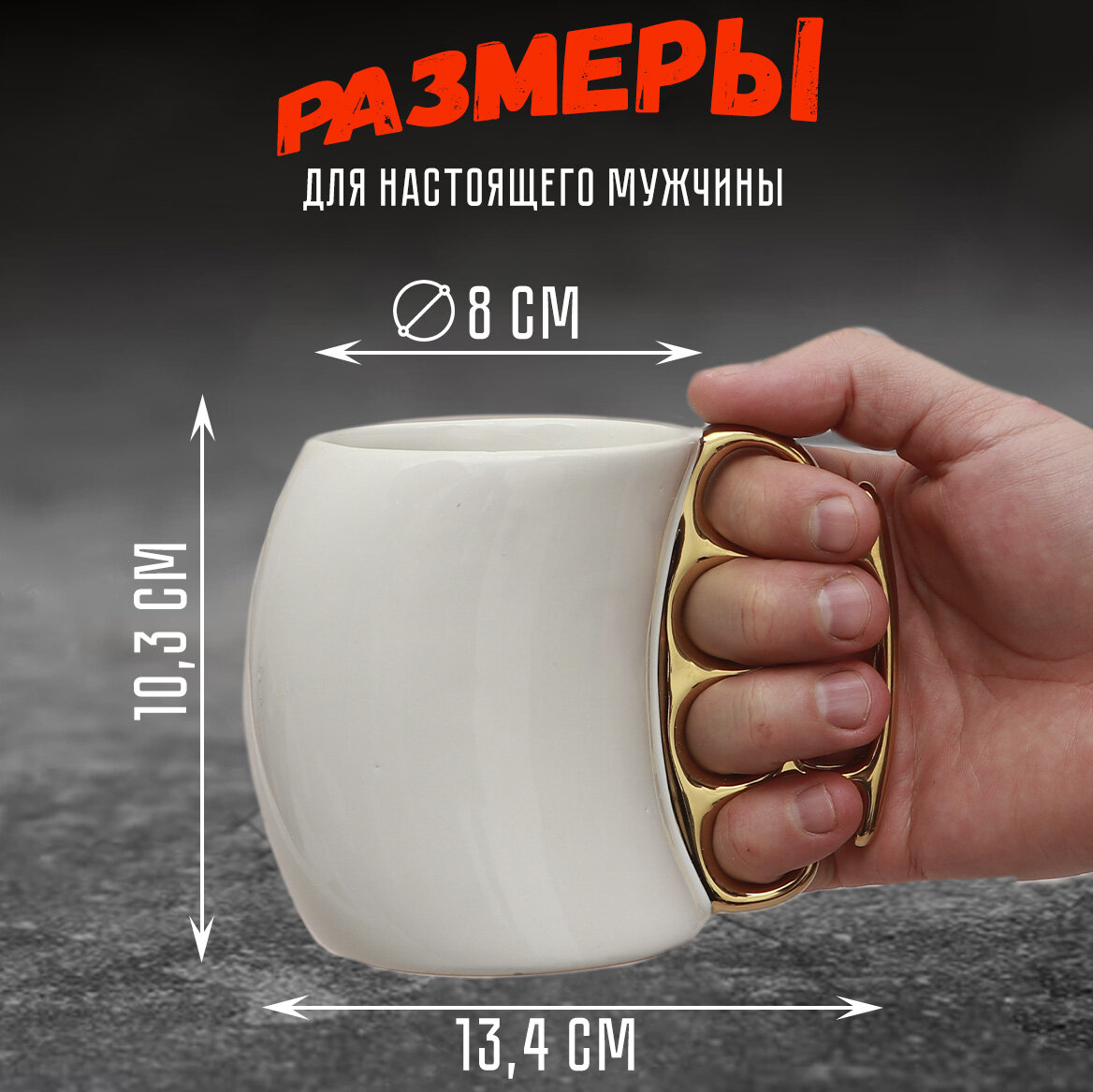 Кружка мужская Кастет 400 мл, белая с золотистой ручкой, для чая и кофе, большая, подарочная на 23 февраля информация: