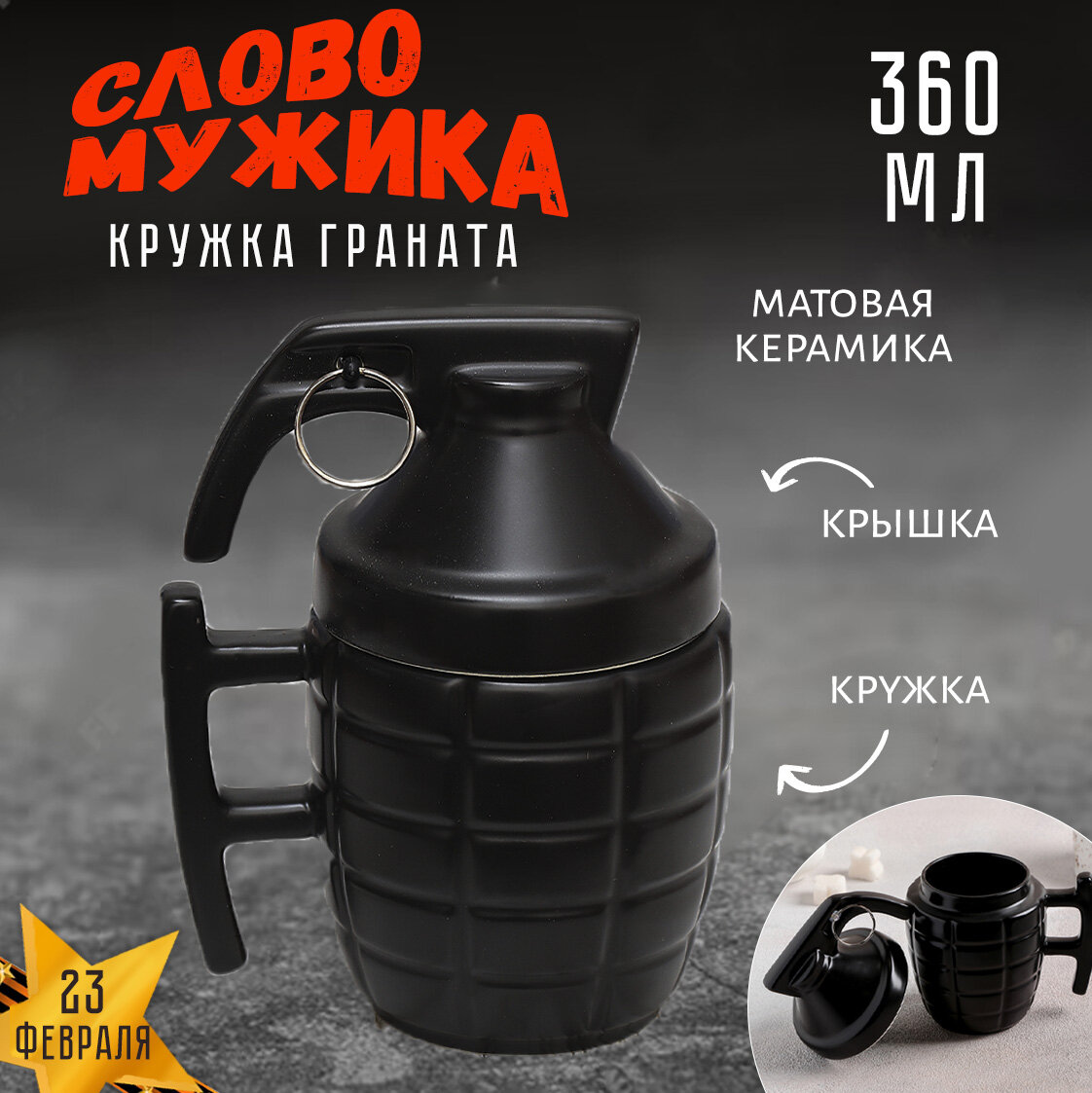 10 цен на Кружка мужская Граната 360 мл, черная, чашка с крышкой, для чая и кофе, подарочная на 23 февраля
