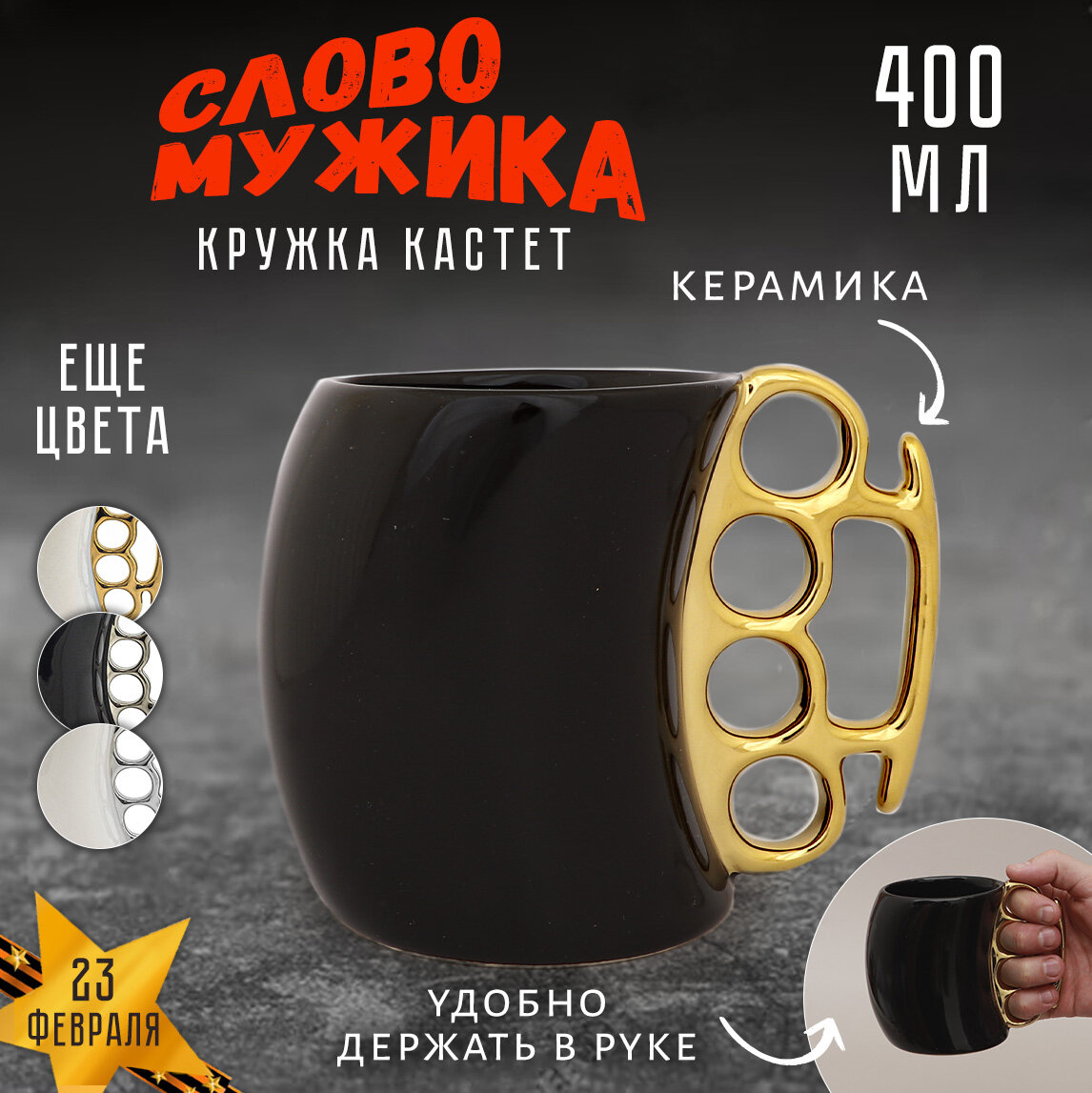 Отзывы на Кружка мужская Кастет 400 мл, черная с золотистой ручкой, для чая и кофе, большая, подарочная на 23 февраля
