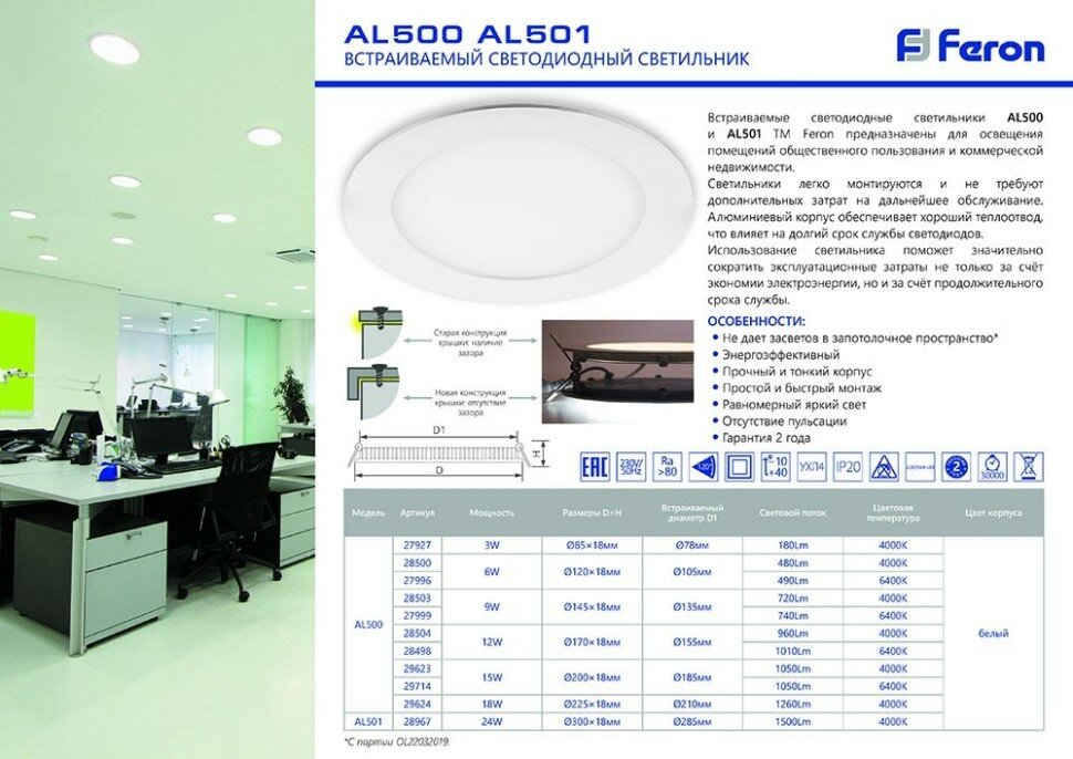 Светодиодный светильник Feron AL500 встраиваемый 12W 6400K белый информация: