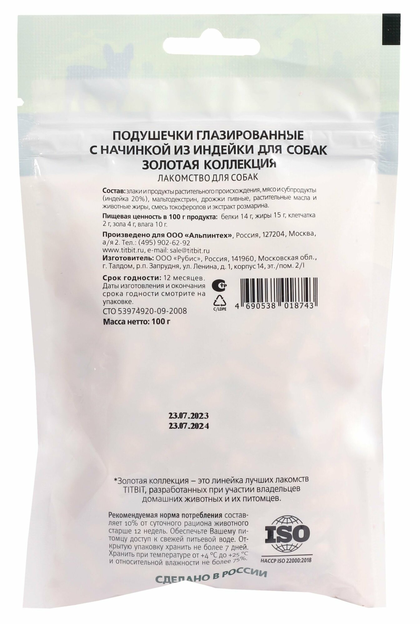 Лакомство TiTBiT золотая коллекция подушечки с индейкой глазированные для собак (100 г) информация: