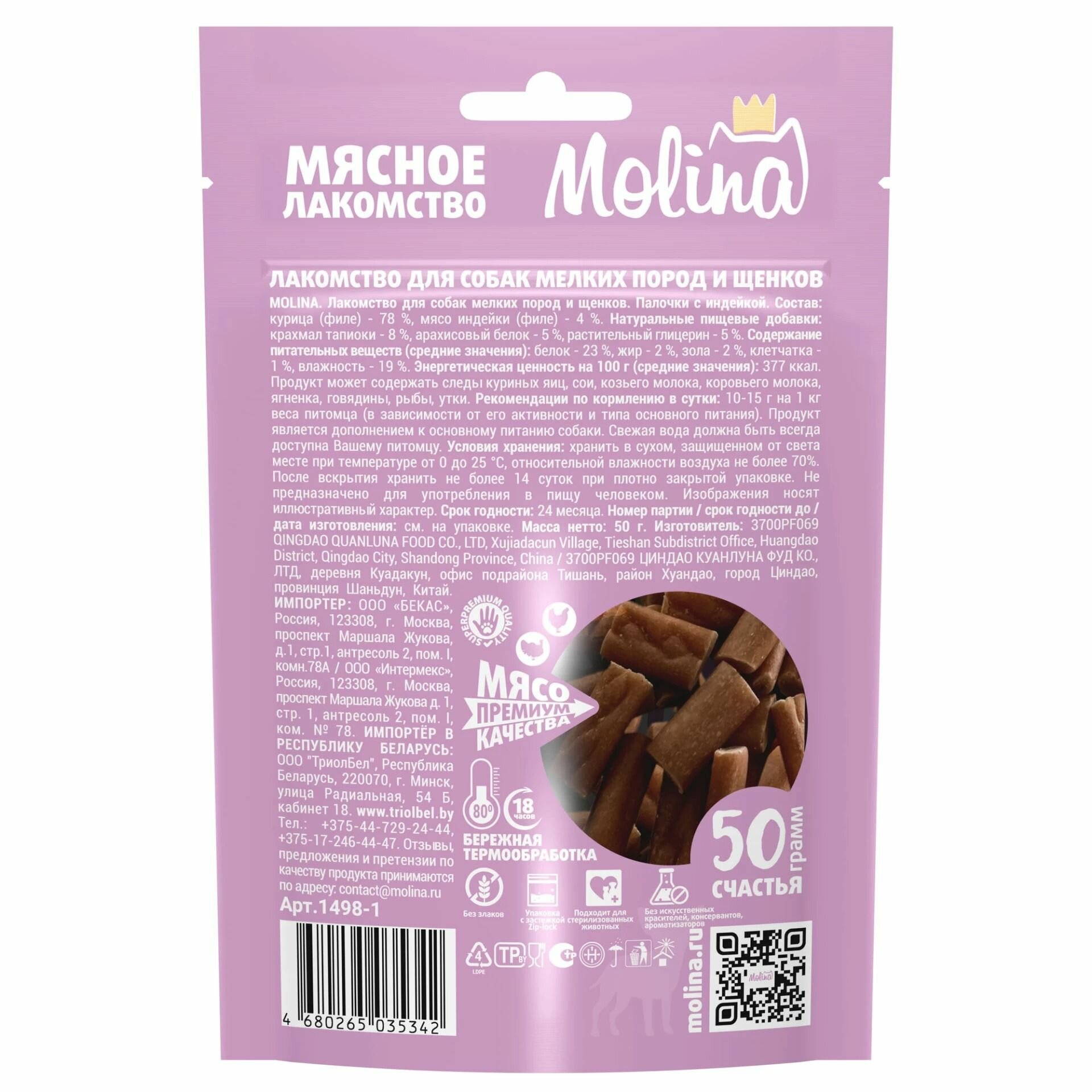 MOLINA, Лакомство для собак мелких пород и щенков, Палочки с индейкой, 50 г информация: