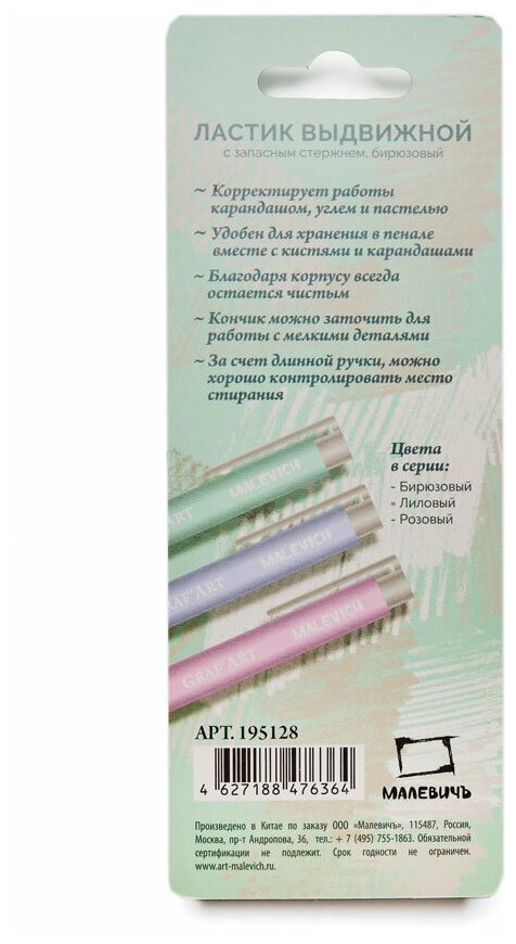 Ластик выдвижной Малевичъ с запасным стержнем, средней жесткости, бирюзовый информация: