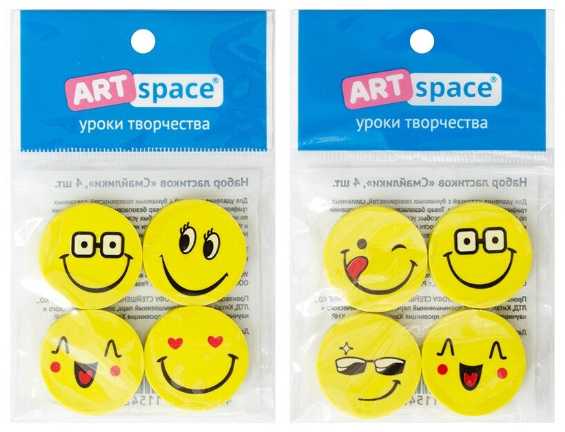 10 цен на Набор ластиков ArtSpace "Смайлики" (круглые, термопластичная резина, 25x5мм) 4шт, 36 уп. (ER_13542)