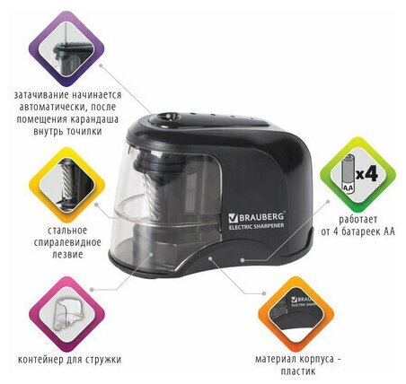 Точилка электрическая BRAUBERG "JET", питание от 4 батареек АА, спиралевидное лезвие, 228426 информация: