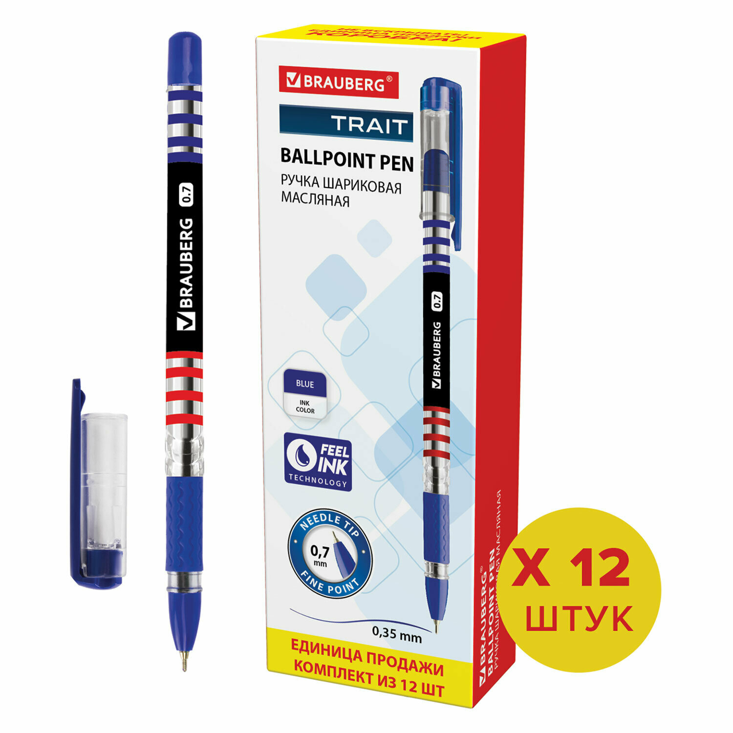 Ручка шариковая масляная с грипом BRAUBERG Trait, комплект 12 штук, синяя, узел 0,7 мм, 880184 информация: