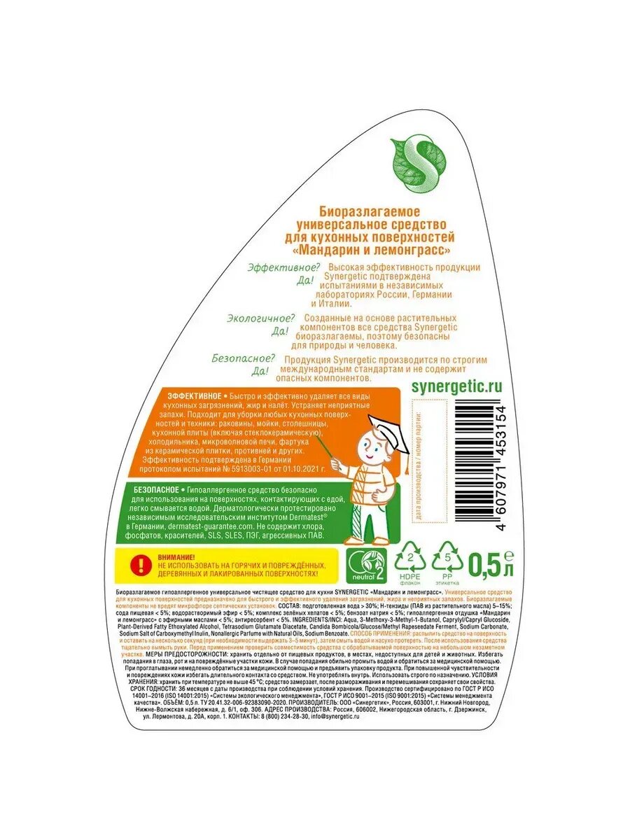 Чистящий спрей Synergetic Мандарин и лемонграсс, для кухни, универсальный, 500 мл