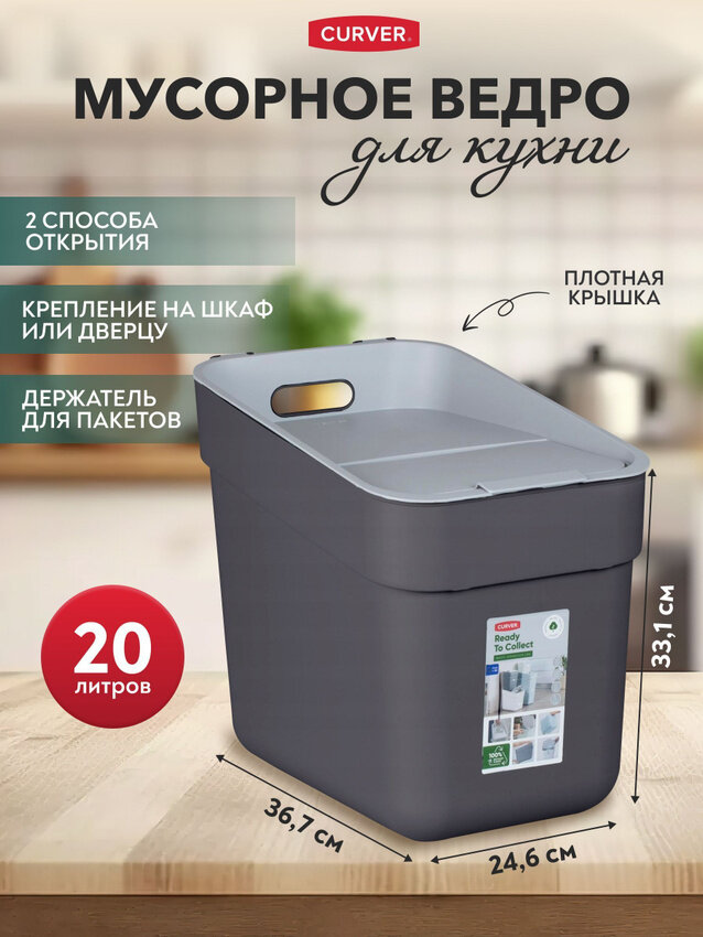 Мусорное ведро с крышкой для кухни Curver Ready to collect 20 литров, 2102 антрацит/св. серый информация:
