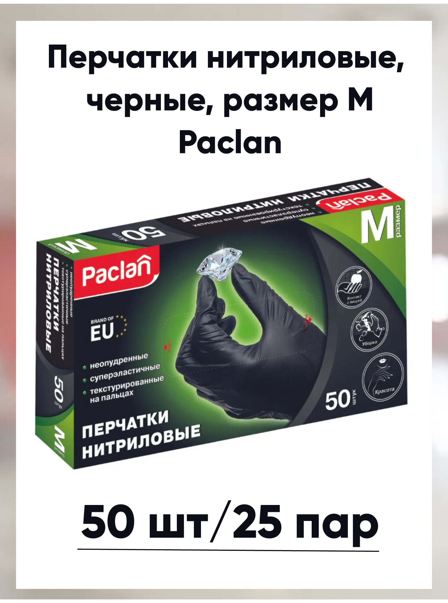 Перчатки нитриловые, черные, 50шт M, Paclan информация: