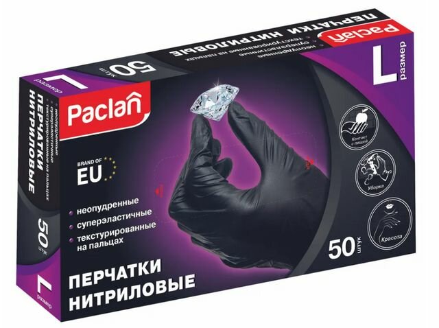 Перчатки нитриловые черные Paclan размер M 50 шт суперэластичные текстурированные без пудры