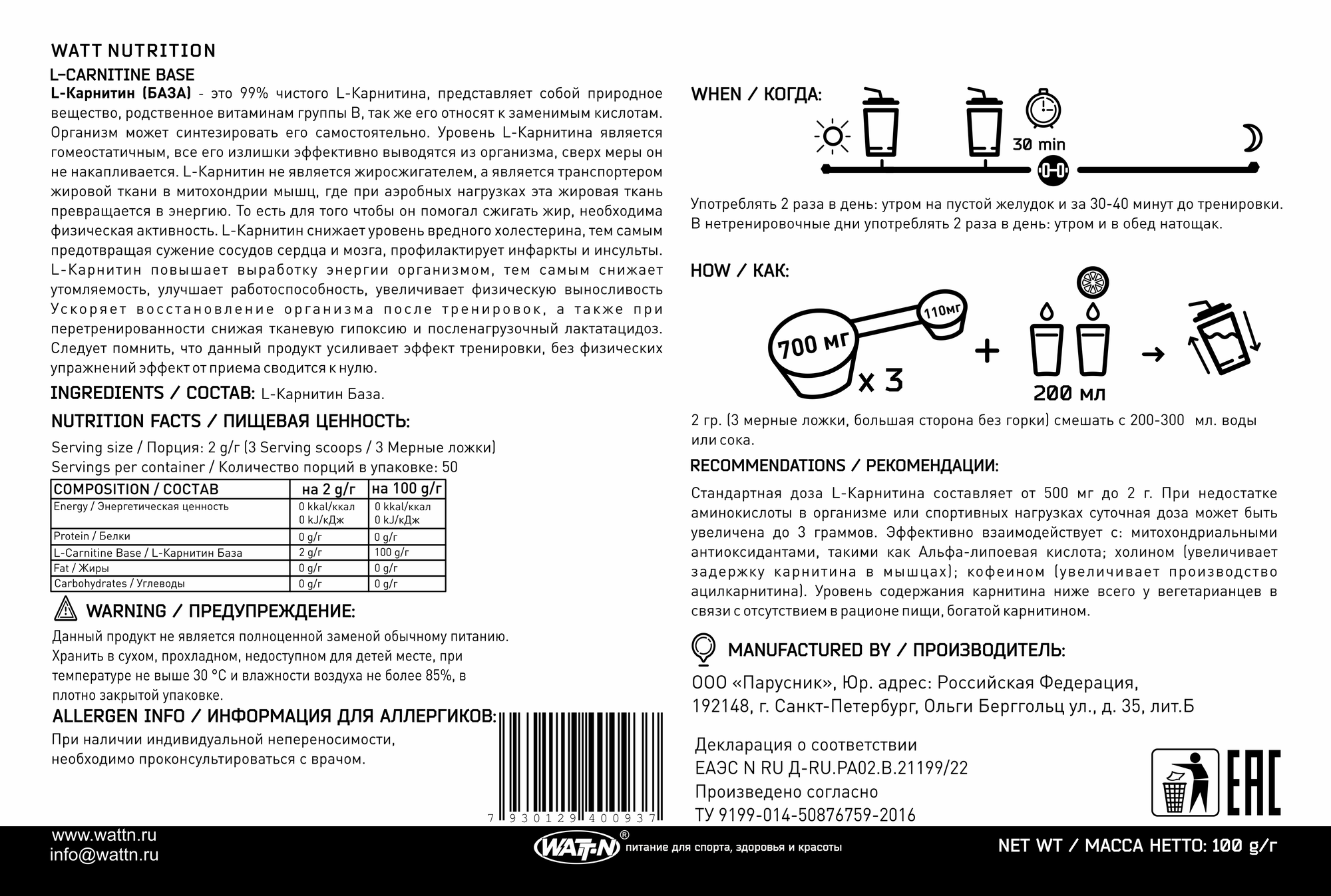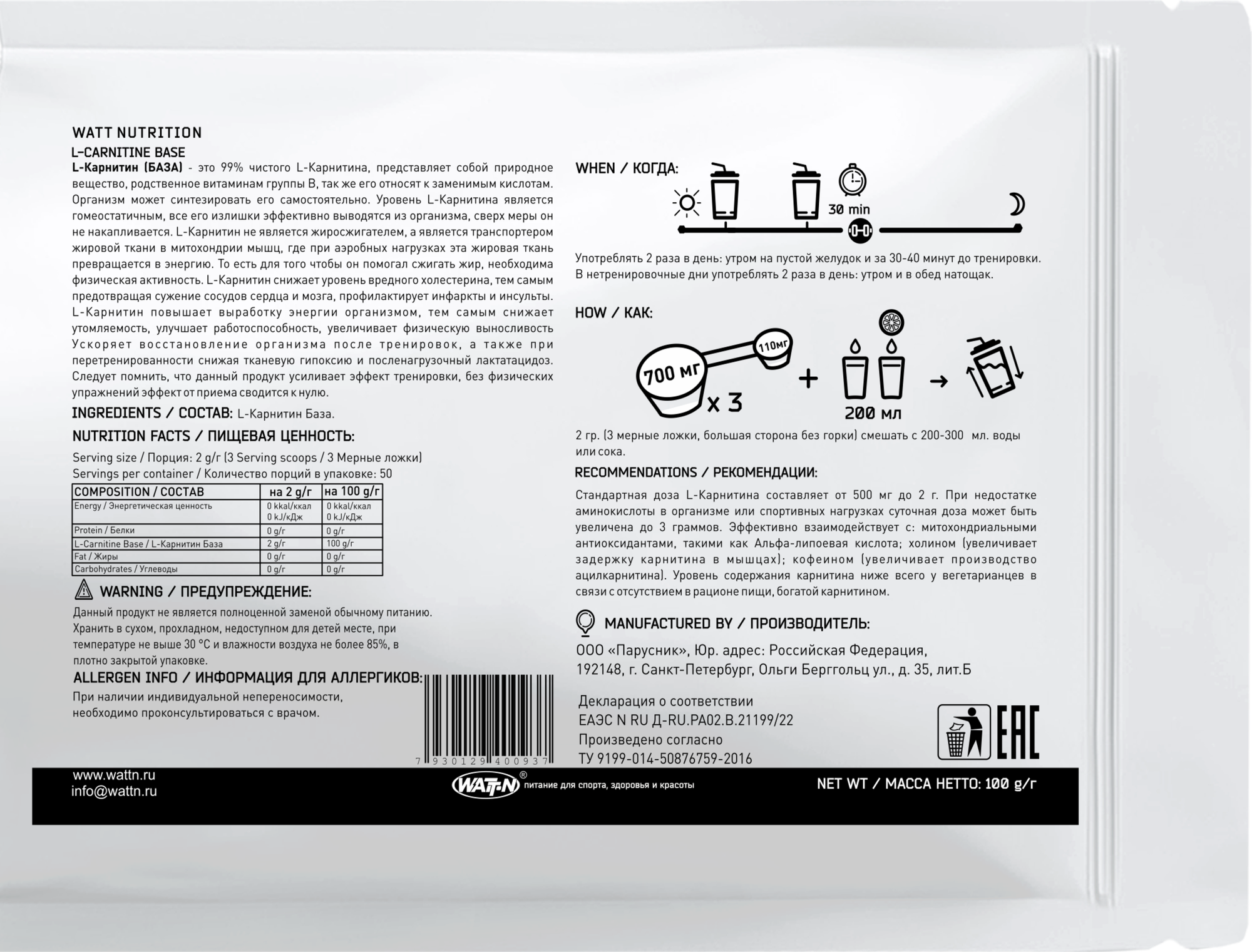 10 цен на Аминокислота WATT NUTRITION L-Карнитин (БАЗА) 100 гр, нейтральный вкус, порошок