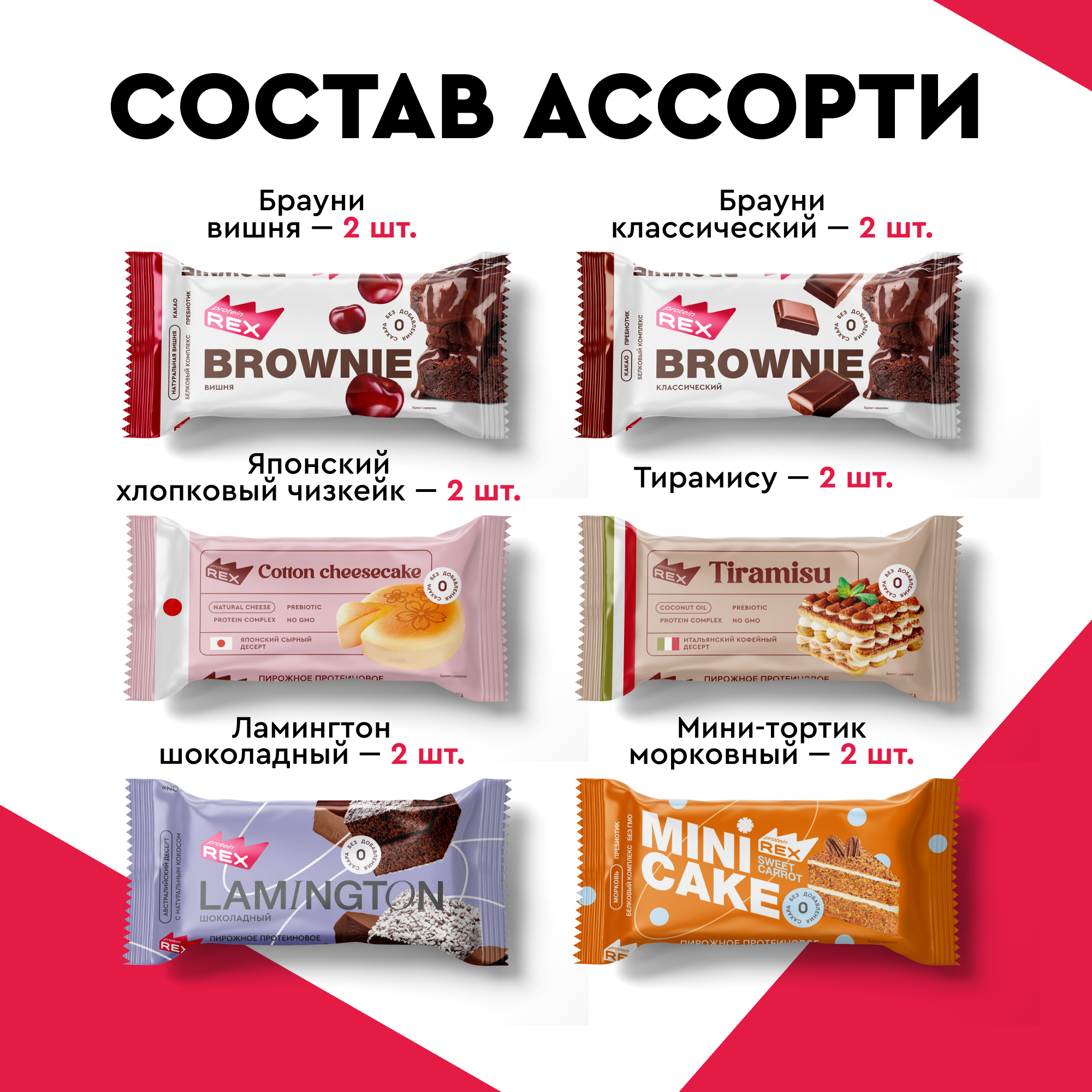 ProteinRex Протеиновое печенье без сахара Брауни, Ламингтоны, Тортики Ассорти 12 шт. , спортивное питание информация: