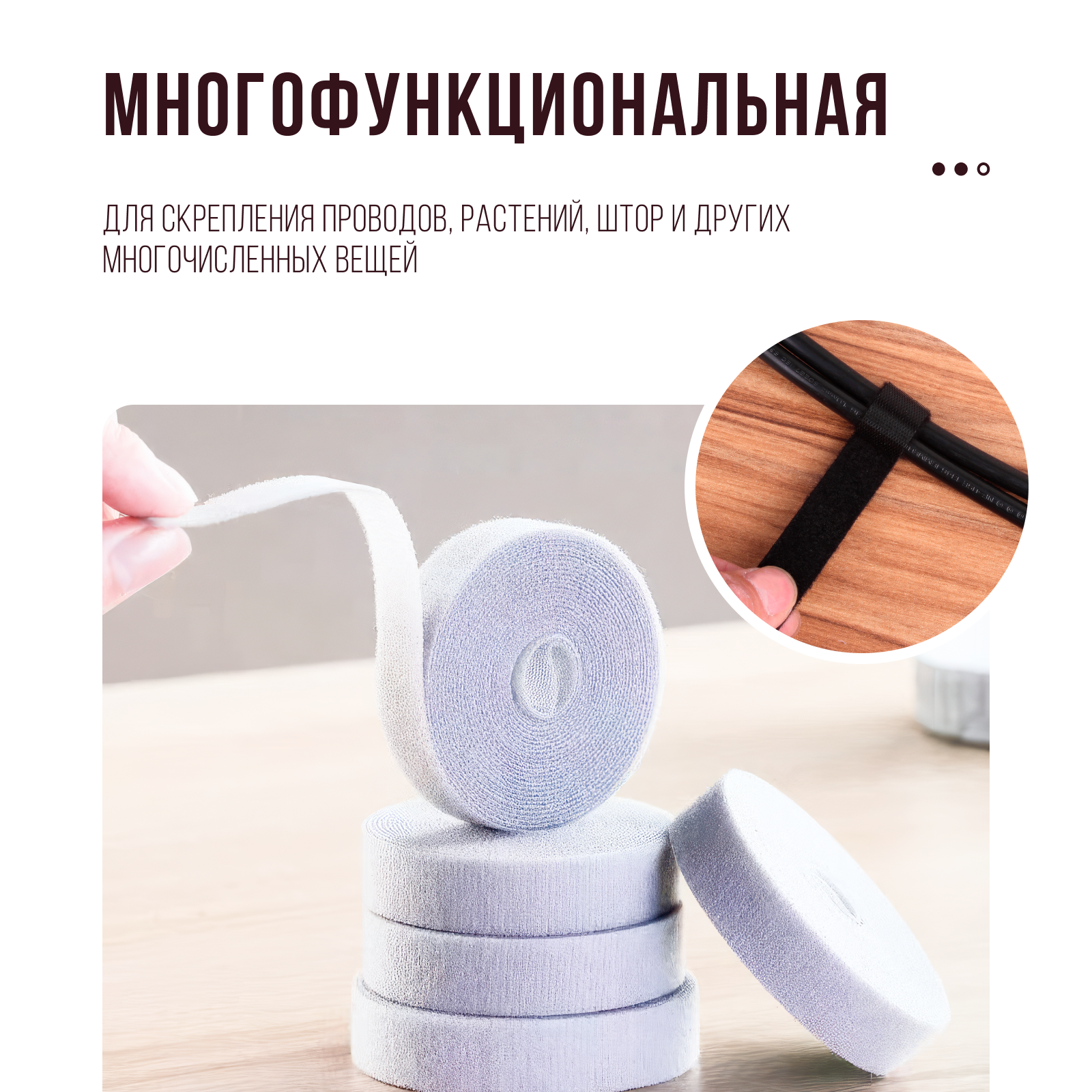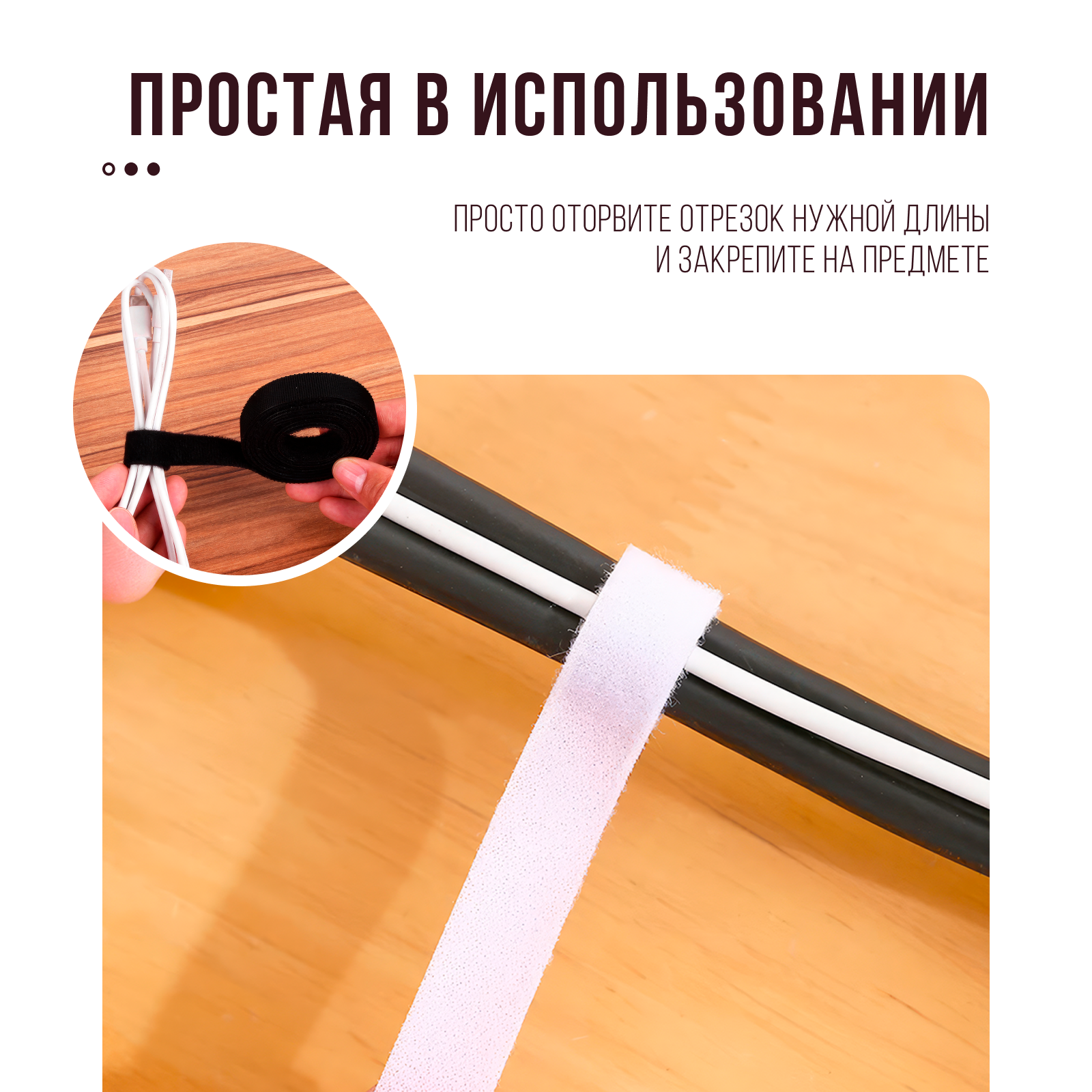 Лента липучка для проводов белая / Органайзер, стяжка, крючки, петли, хомут, скотч для кабеля многоразовая, отрывная информация:
