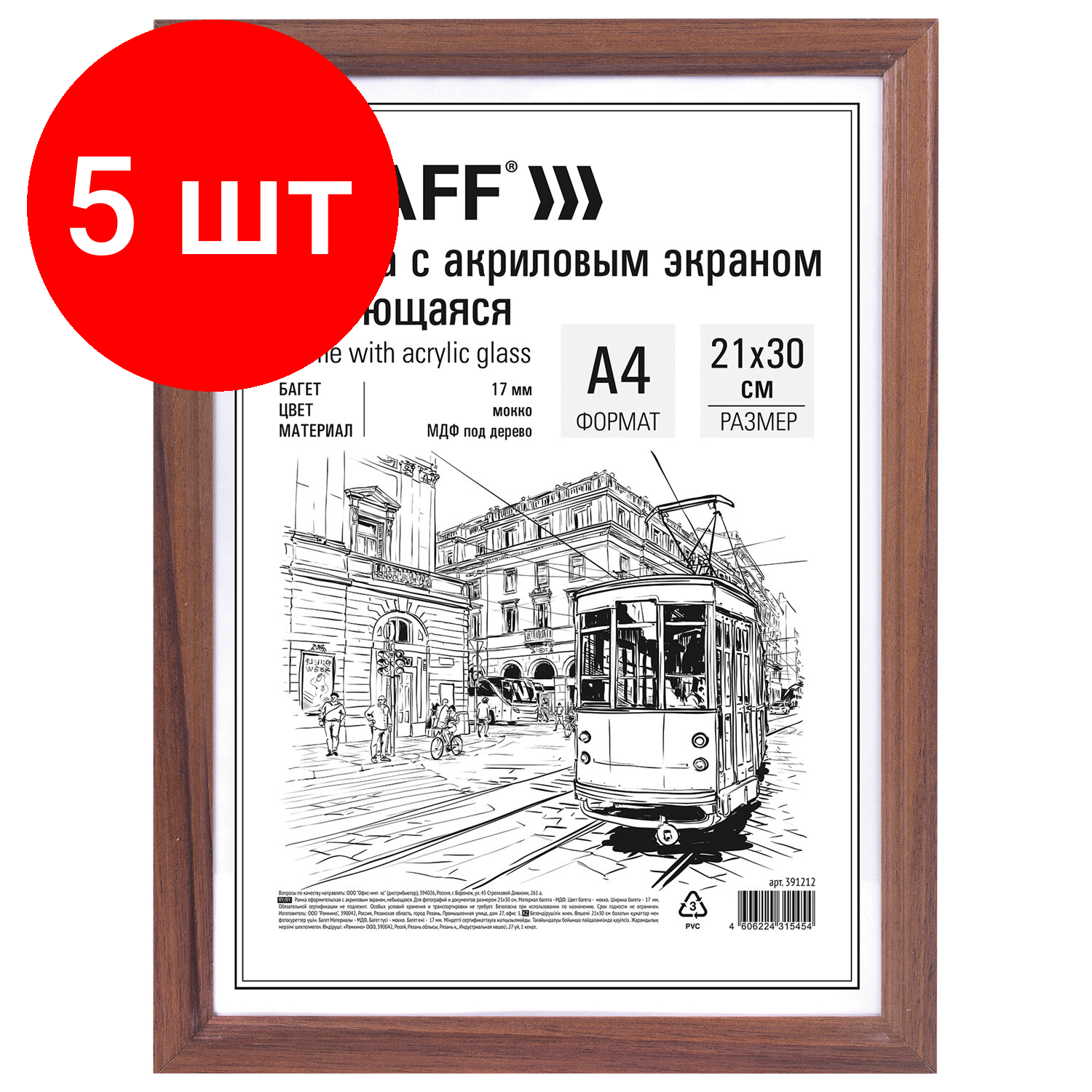 Комплект 5 шт, Рамка деревянная 21х30 см с акриловым стеклом, небьющаяся, багет 17 мм, мокко, STAFF "Carven", 391212 информация:
