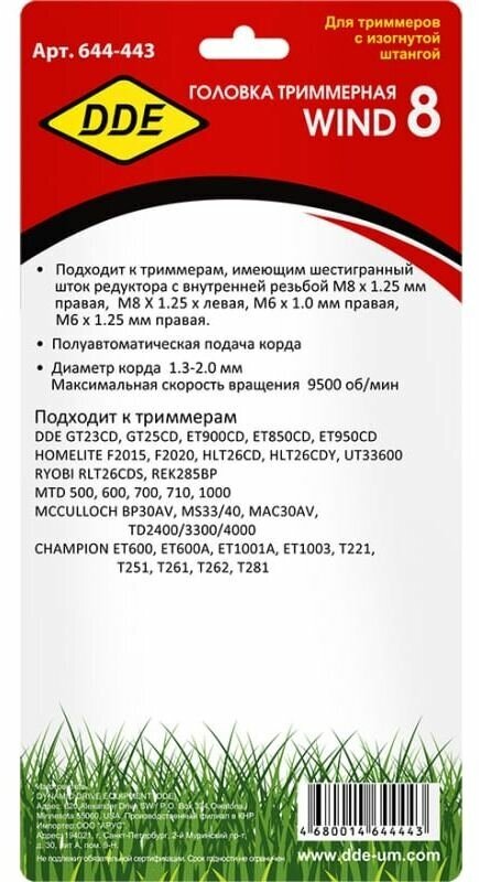 Отзывы на Головка триммерная WIND DDE Wind 8 (M8х1,25мм правая, + М6х1,25мм правая, + М6х1,0мм правая)