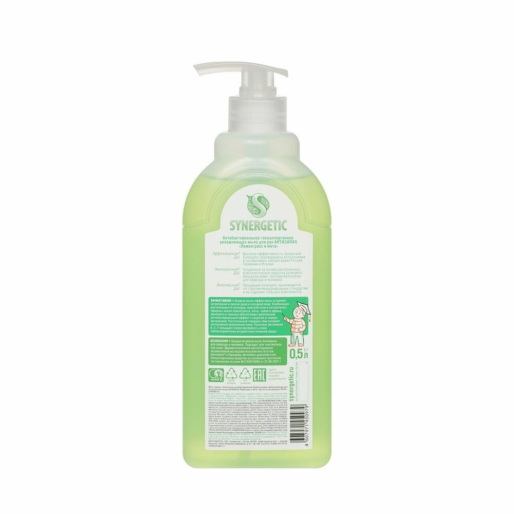 Жидкое мыло для рук Synergetic антибактериальное нейтрализующее запах "Лемонграсс и мята" 500 мл информация:
