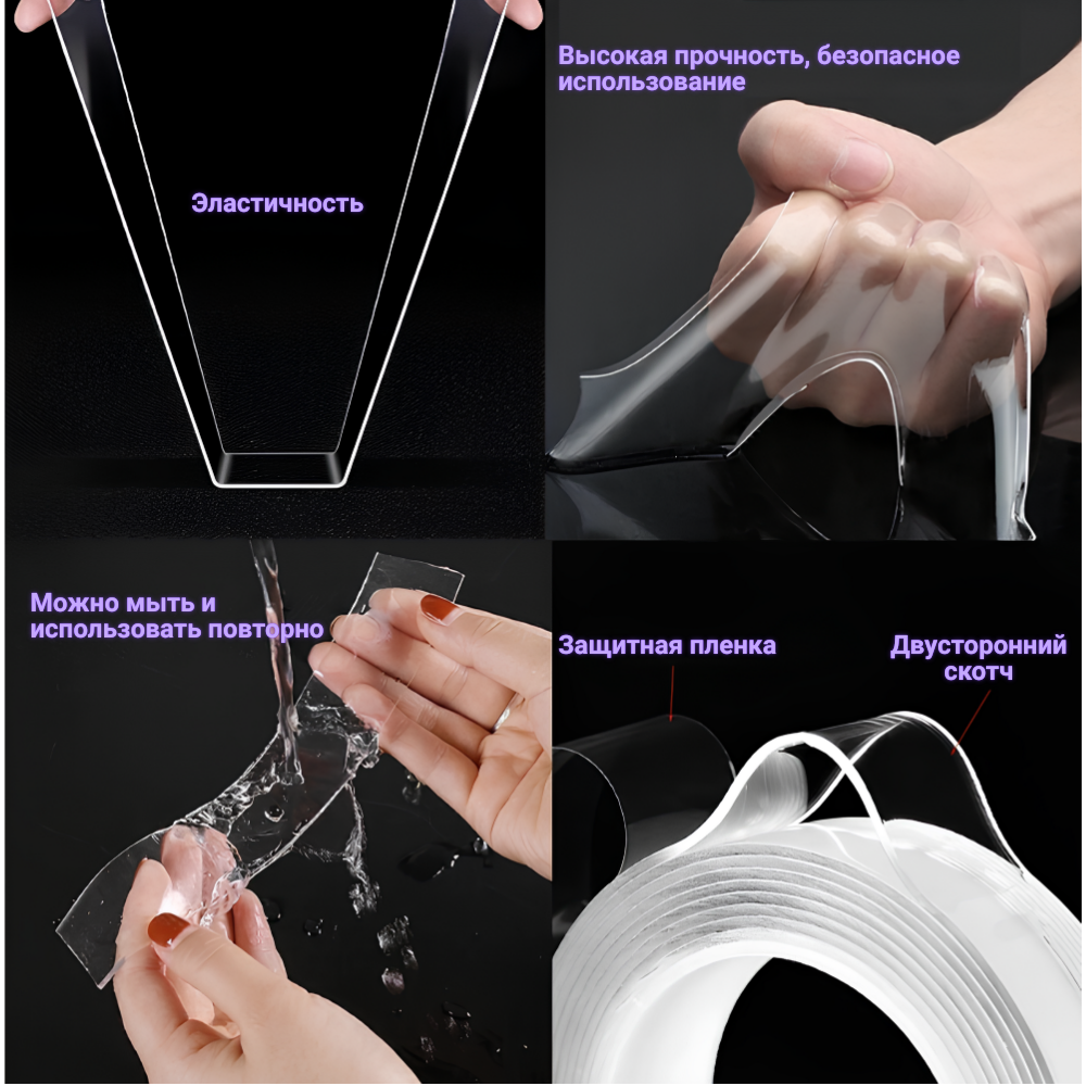 Отзывы на Скотч-лента/ширина 5см, длина 5м, толщина 1мм /двухсторонний/сверхсильный/многоразовый/прозрачный/ "нанолента"