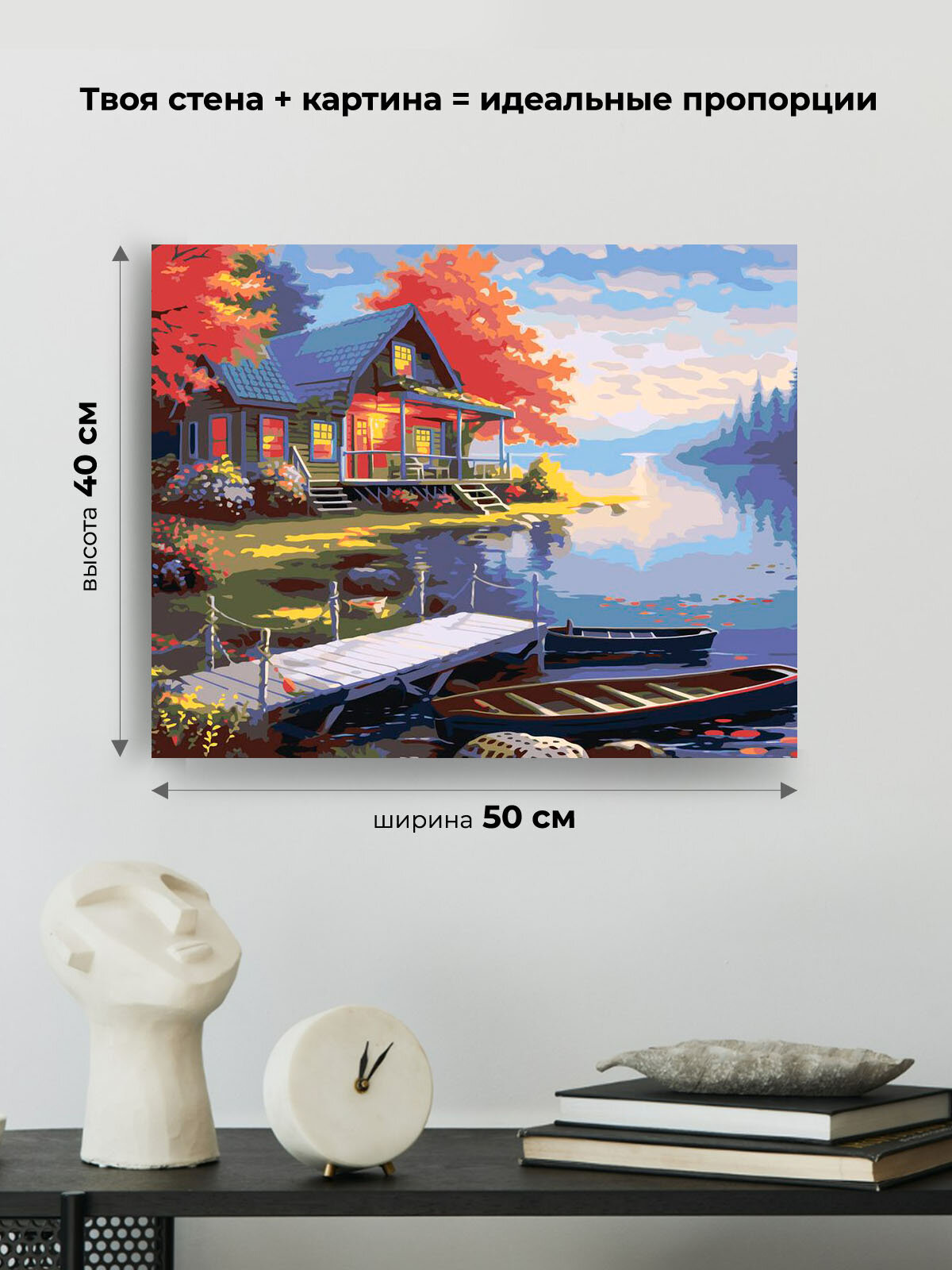 Картина по номерам на холсте с подрамником "Природа: Пейзаж с домиком и лодками на берегу озера", Раскраска 40х50 см информация: