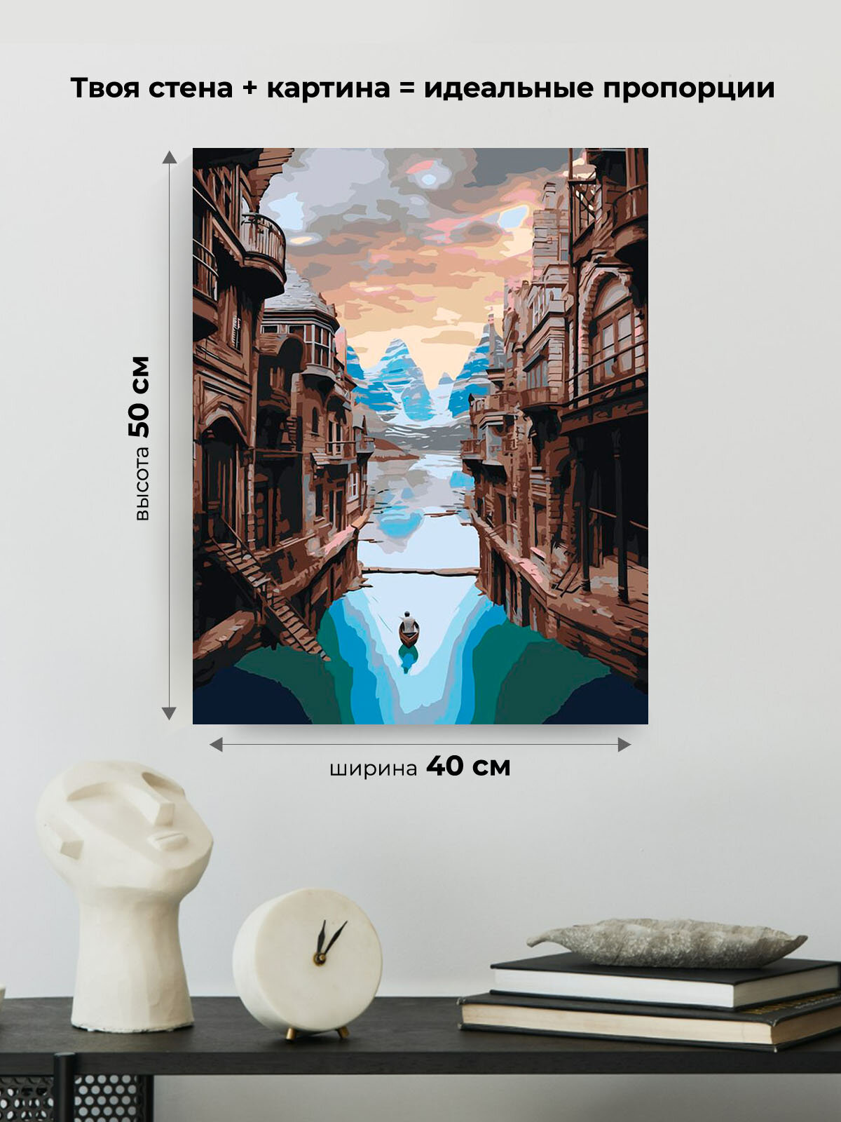 Картина по номерам на холсте с подрамником "Природа: Пейзаж с человеком в лодке на фоне гор и домов", Раскраска 40х50 информация: