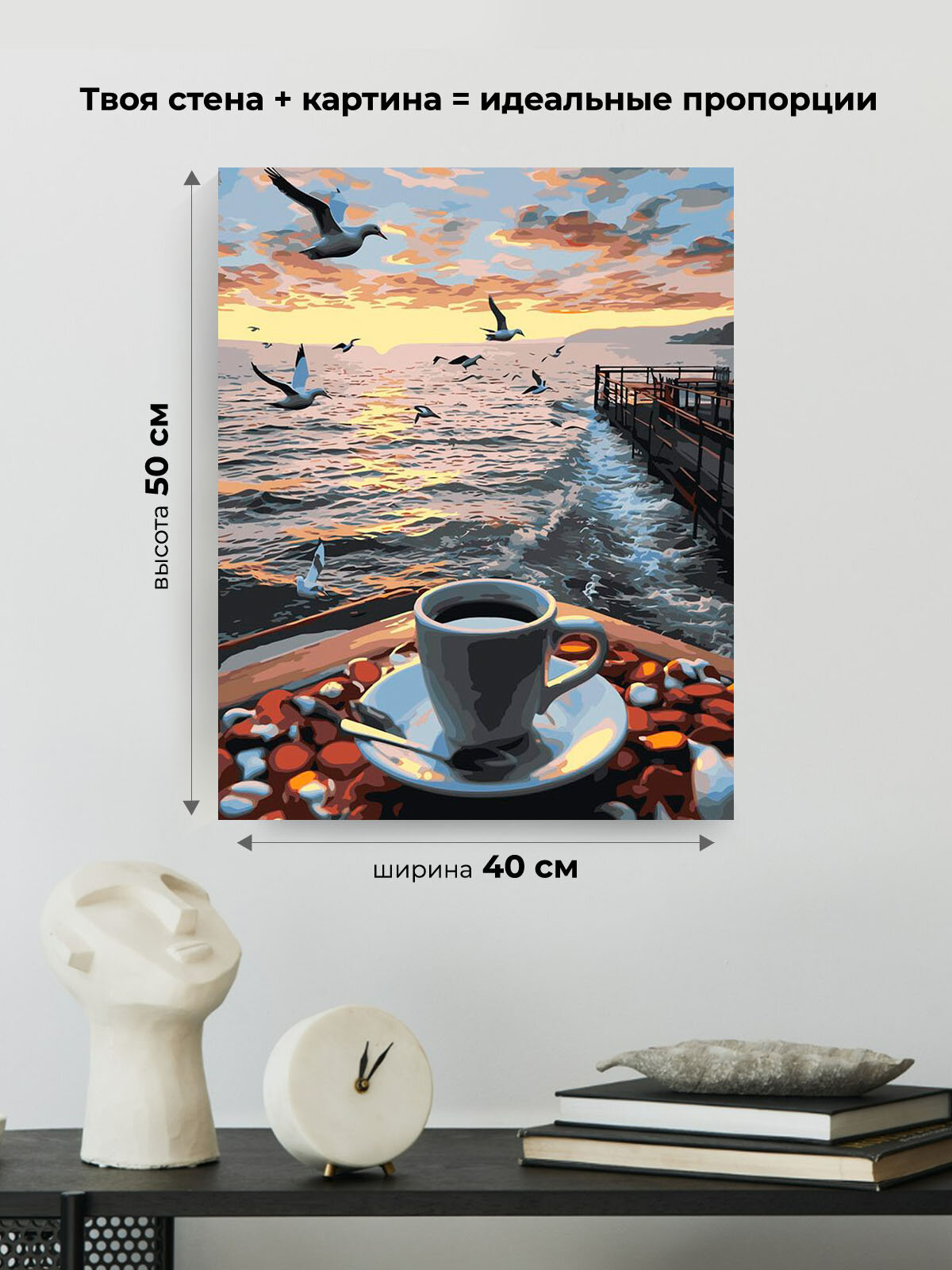 10 цен на Картина по номерам на холсте с подрамником "Море: Кофе на уютном берегу 2" Раскраска 40x50 см, Чашки Чайки Птицы Природа