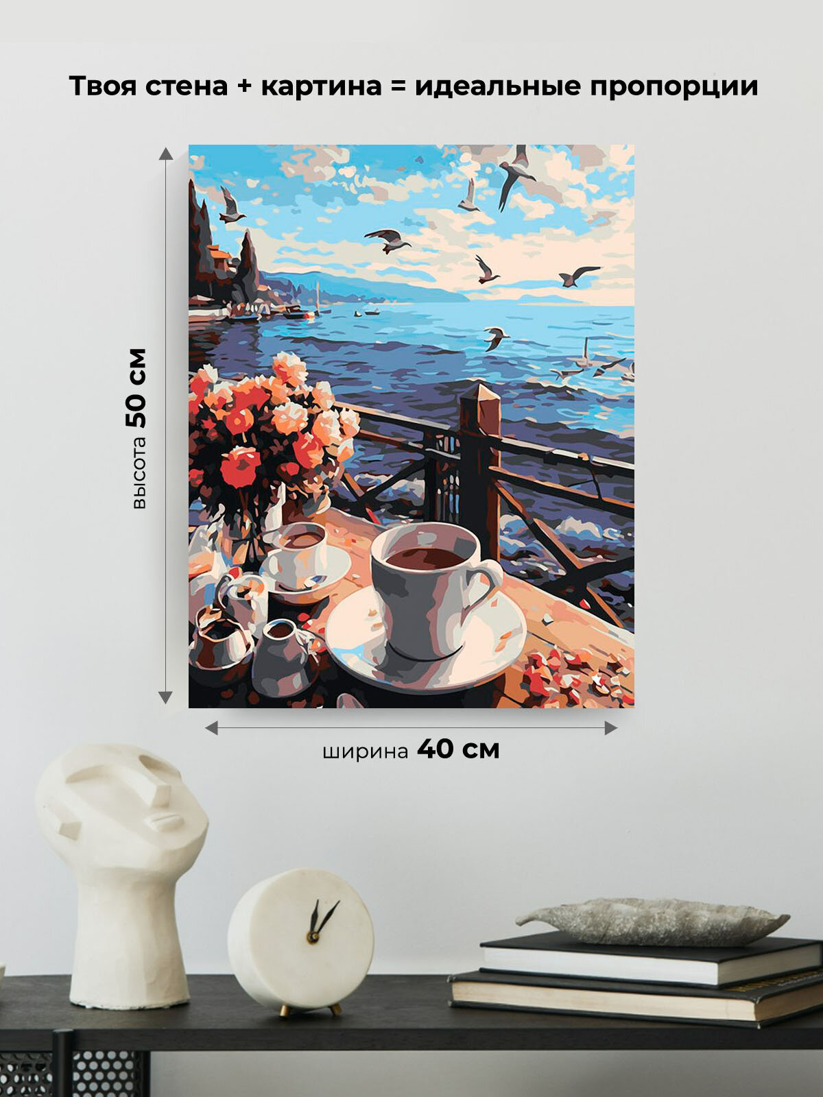 10 цен на Картина по номерам на холсте с подрамником "Море: Кофе на уютном берегу" Раскраска 40x50 см, Чашки Чайки Птицы Природа