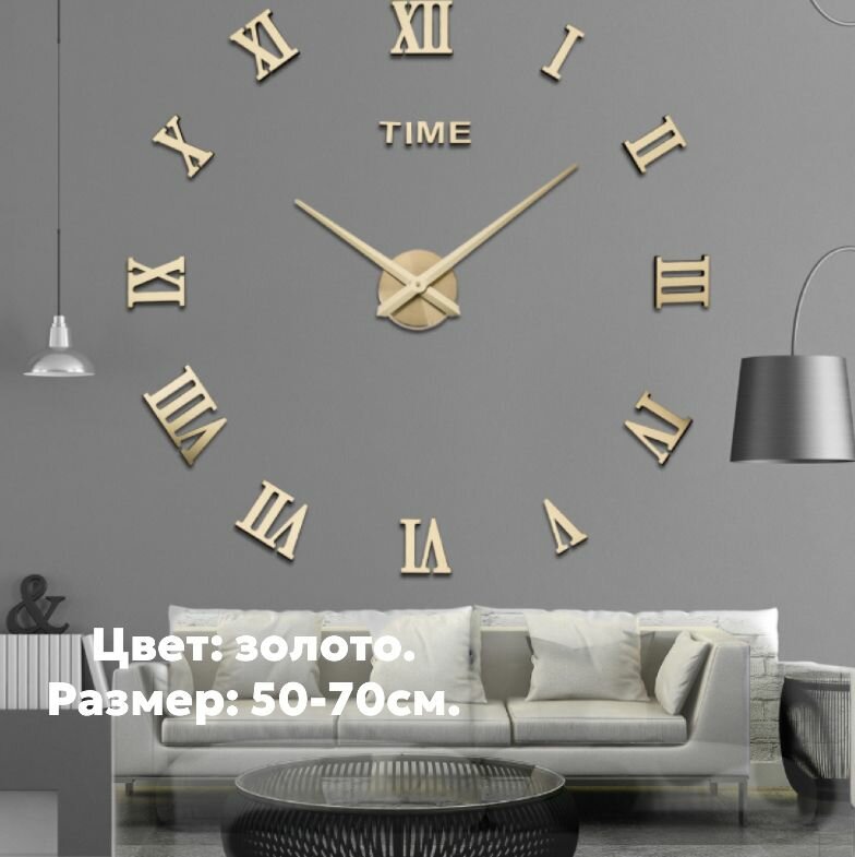 Самоклеющиеся Настенные Часы J. Tree, Бесшумные на стену в гостинную, спальню, кухню. Золотые. Размер 70-90см. 1 419 ₽
