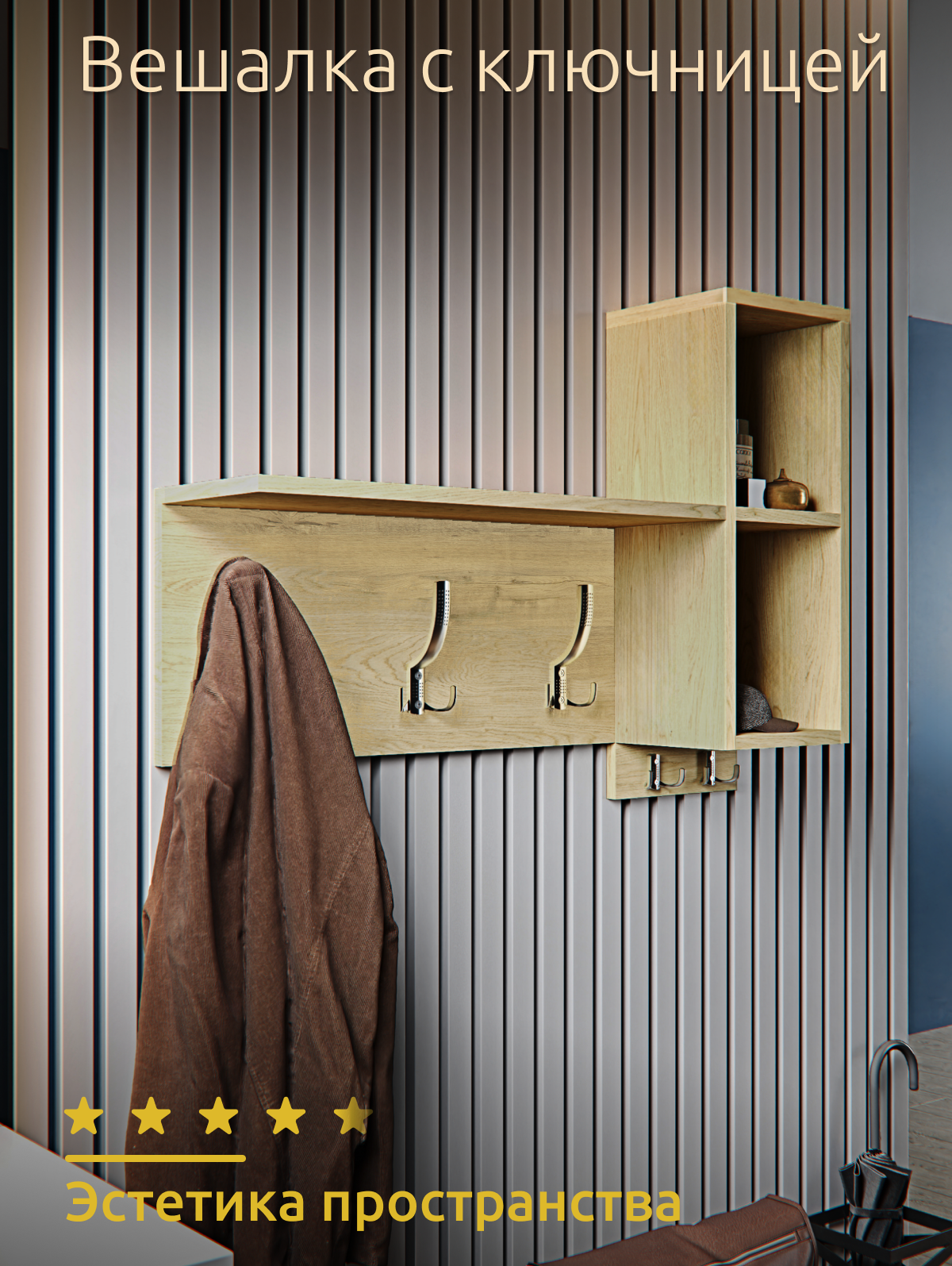 Отзывы на Вешалка, настенная, деревянная с полками в прихожую для одежды , светло бежевая 80х20х62 см.