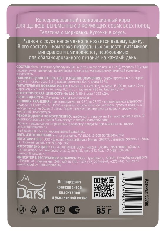 Корм для собак Darsi Влажный корм для щенков всех пород Телятина с Морковью, пауч (85 г) информация: