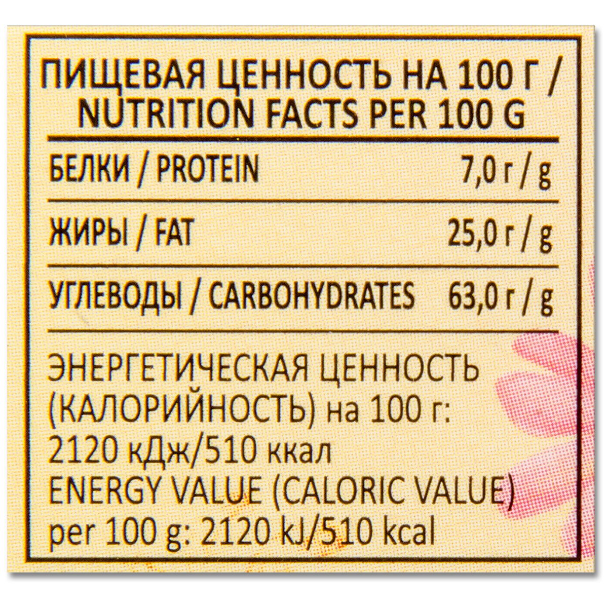| Состав | Мука пшеничная общего назначения тип М55-23, сахар, вода питьевая, патока, жиры специального назначения (рафинированные дезодорированные рмука пшеничная, сахар, масло растительное (рафинированное дезодорированное кокосовое, антиокислитель Е330), жиры кондитерские (рафинированное дезодорированное пальмовое масло, жир говяжий топленый, антиокислитель (экстракт розмарина), регулятор кислотности Е260, краситель Е160а, ароматизатор (сливочное масло)), кокосовая стружка (обжаренная кокосовая стружка, сахар), кунжут обжаренный, сыворотка молочная, молоко сухое цельное, разрыхлители (гидрокарбонат аммония, гидрокарбонат натрия), соль, сырный порошок (сыр, эмульгирующая соль Е339), глюкоза, премикс (мука пшеничная, мука рисовая, пшеничный крахмал), соль (соль, антислеживающий агент Е551, усилитель вкуса и аромата Е620), стабилизатор (карбонат кальция), ароматизаторы (кокос, молоко), загуститель (ксантановая камедь), антиокислитель (пиросульфит натрия). |