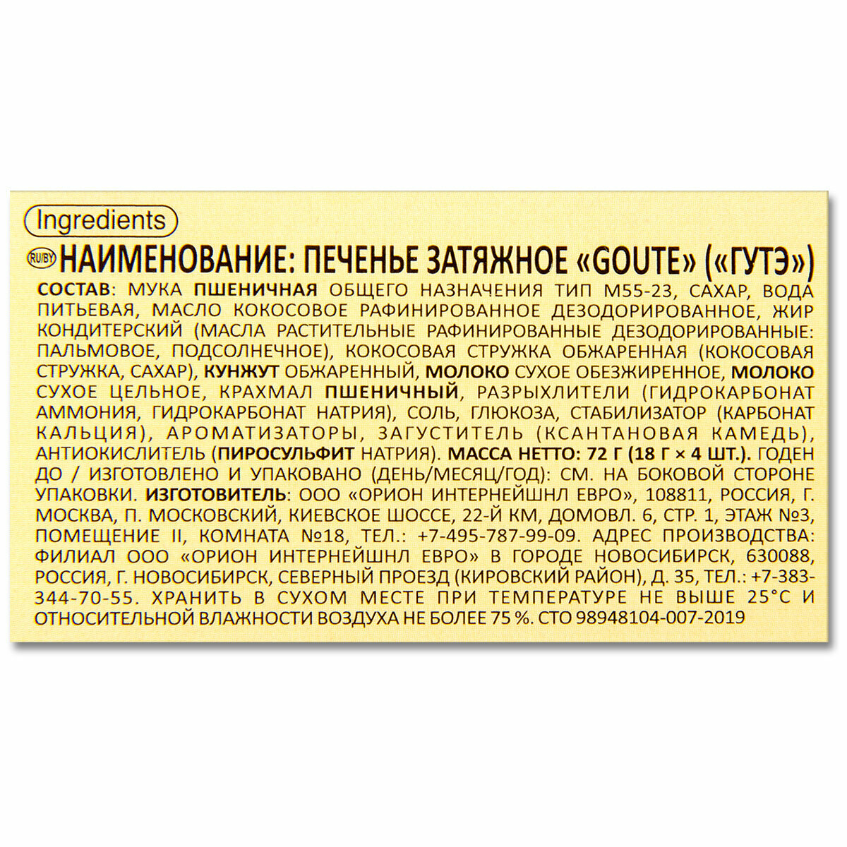 Печенье затяжное ORION Goute, 4 шт, 72 г, 16 уп. информация: