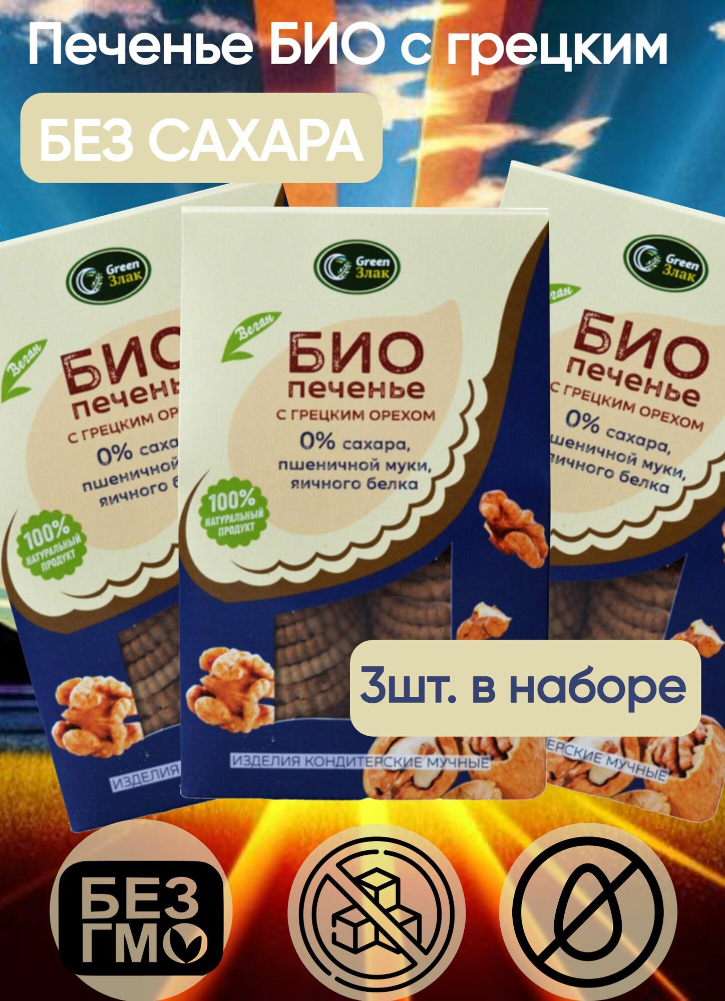 Печенье БИО с грецким орехом, без сахара, без пшеничной муки, без яичного белка, 150 гр Green Злак (3 шт. в наборе) информация: