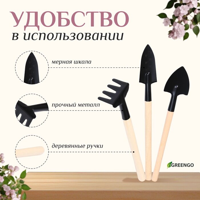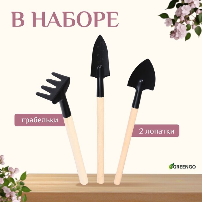 10 цен на Набор садового инструмента, 3 предмета: грабли, 2 лопатки, длина 24 см, деревянные ручки, Greengo
