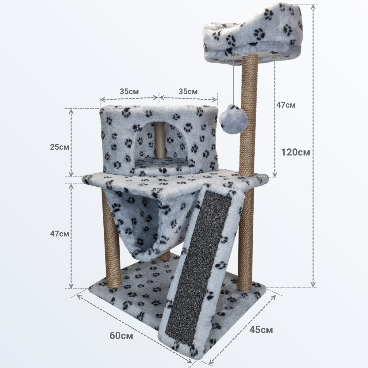 Игровой комплекс "Жмурка" с домиком, гамаком и когтеточкой, 60*45*120см, цвет: серый с лапками информация: