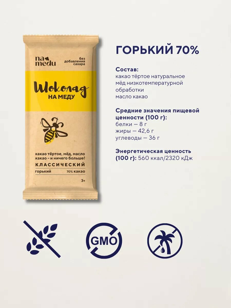 Шоколад горький Без сахара на меду 70% - 5 шт информация: