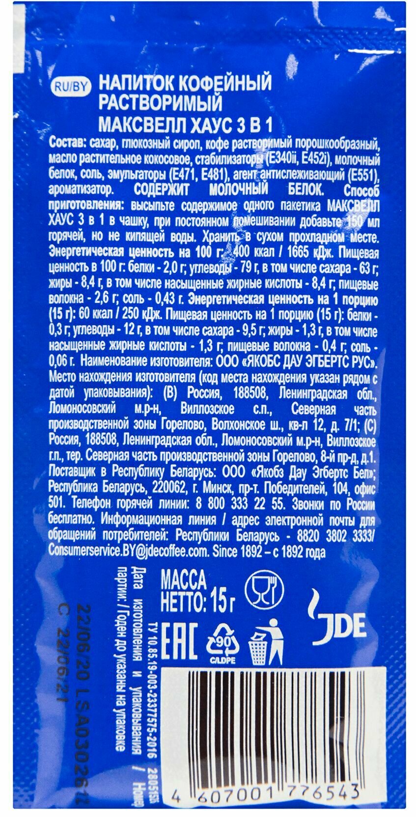 Maxwell House Растворимый кофейный напиток 3 в 1, 12 пакетиков по 15 г информация: