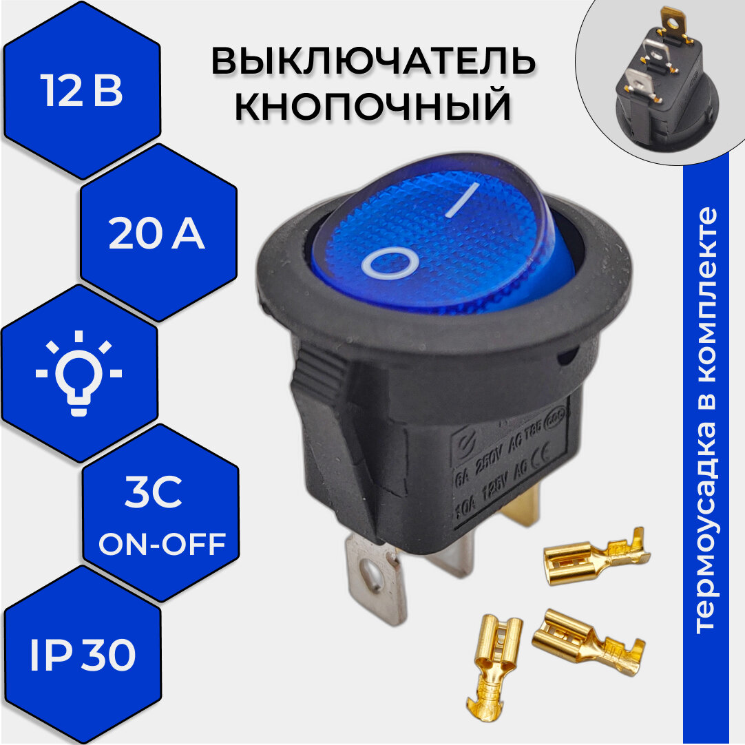 Выключатель клавишный круглый 12V 20А (3с) ON-OFF синий с подсветкой (комплект с клеммами и термоусадкой) 169 ₽