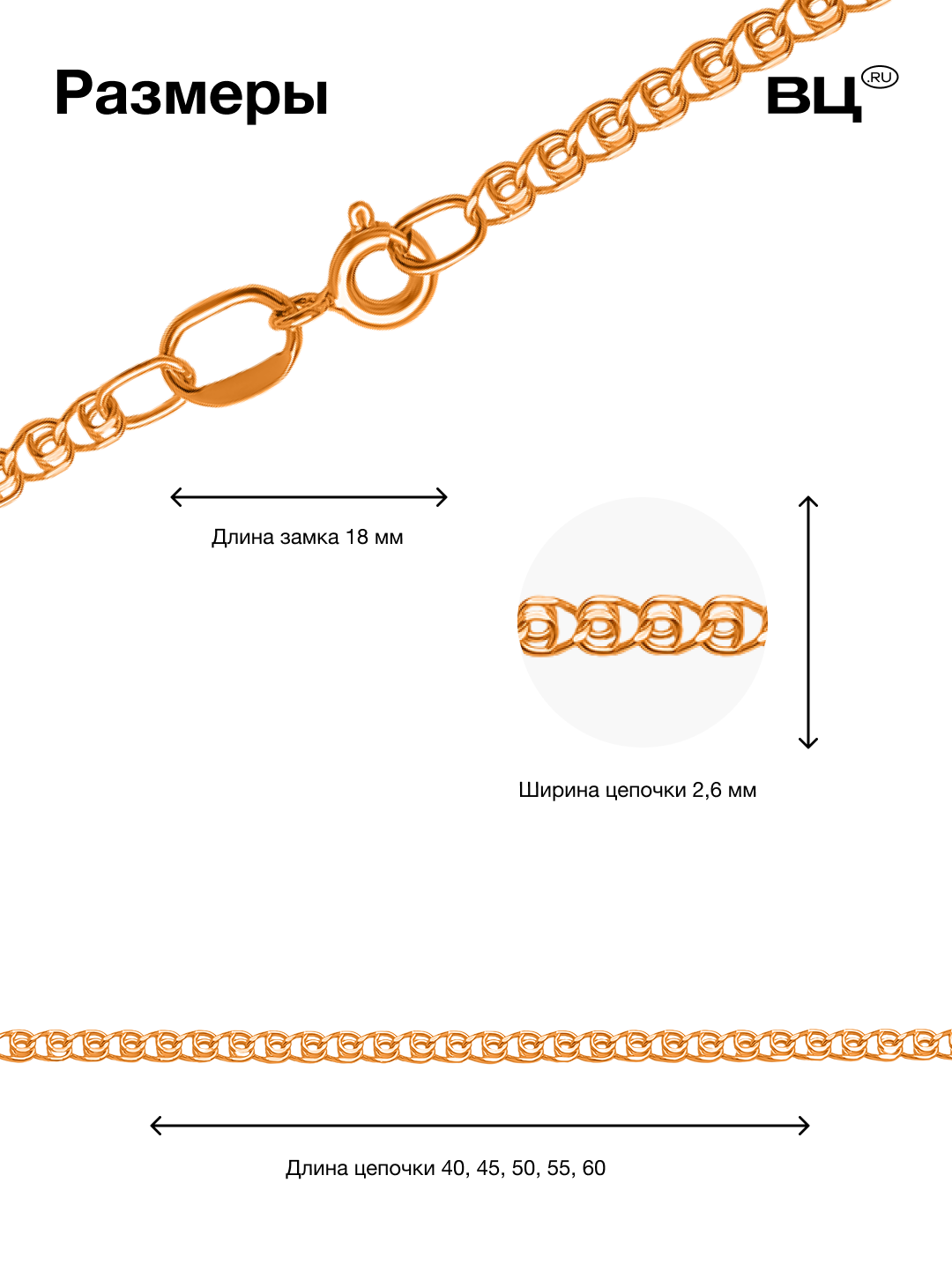 Цепь ВсеЦепочкиRU, красное золото, 585 проба, длина 55 см, средний вес 2.3 г, , красный информация: